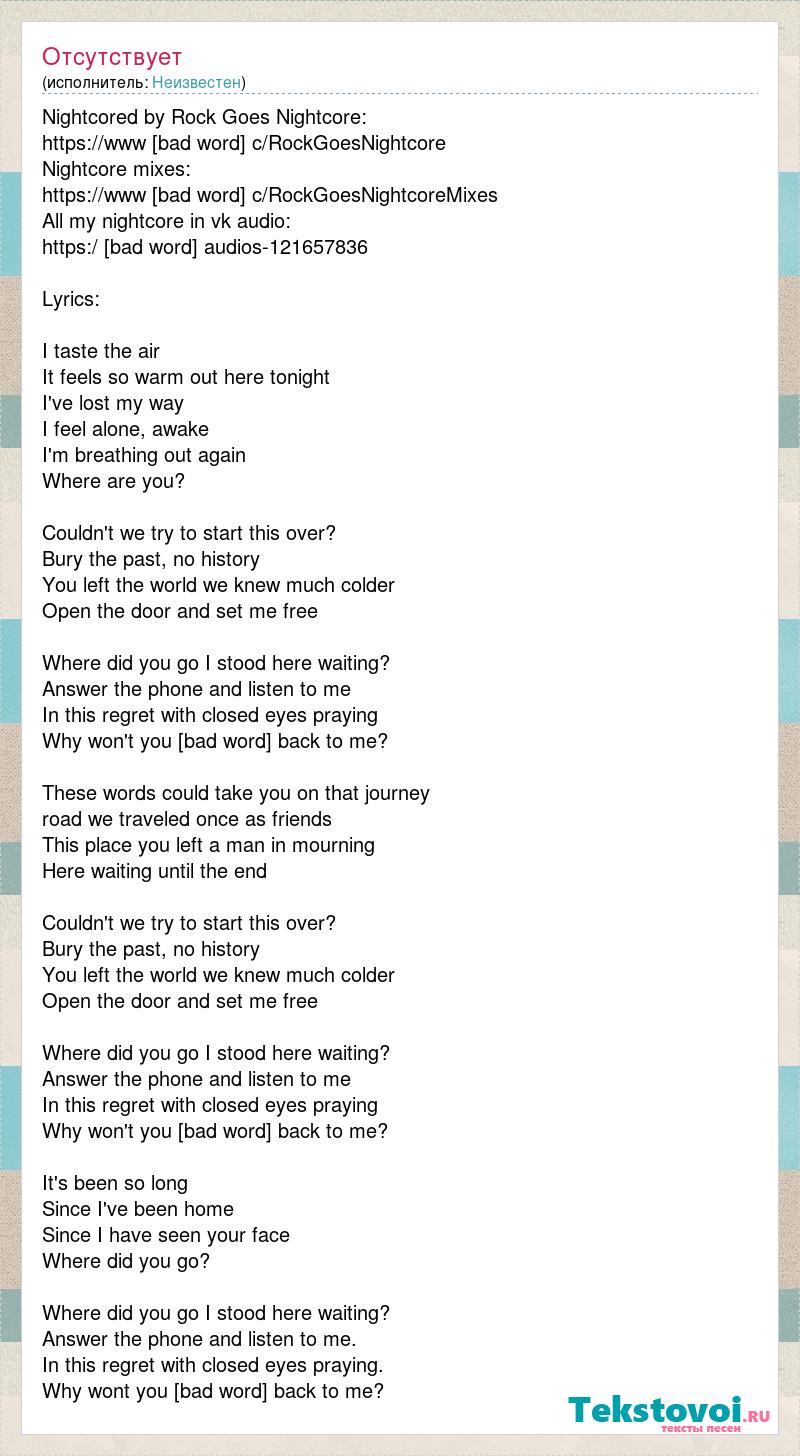 Nightcored by Rock Goes Nightcore: https://www [bad word] c/RockGoesNightcore Nightcore mixes: https://www [bad word] c/RockGoesNightcoreMixes All my nightcore in vk audio: https:/ [bad word] audios-121657836 Lyrics: I taste the air It feels so warm out here tonight I've lost my way I feel alone, awake I'm breathing out again Where are you? Couldn't we try to start this over? Bury the past, no history You left the world we knew much colder Open the door and set me free Where did you go I stood here waiting? Answer the phone and listen to me In this regret with closed eyes praying Why won't you [bad word] back to me? These words could take you on that journey road we traveled once as friends This place you left a man in mourning Here waiting until the end Couldn't we try to start this over? Bury the past, no history You left the world we knew much colder Open the door and set me free Where did you go I stood here waiting? Answer the phone and listen to me In this regret with closed eyes praying Why won't you [bad word] back to me? It's been so long Since I've been home Since I have seen your face Where did you go? Where did you go I stood here waiting? Answer the phone and listen to me. In this regret with closed eyes praying. Why wont you [bad word] back to me?