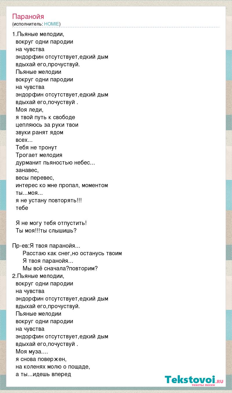 1.Пьяные мелодии, вокруг одни пародии на чувства эндорфин отсутствует,едкий дым вдыхай его,прочуствуй. Пьяные мелодии вокруг одни пародии на чувства эндорфин отсутствует,едкий дым вдыхай его,почуствуй . Моя леди, я твой путь к свободе цепляюсь за руки твои звуки ранят ядом всех... Тебя не тронут Трогает мелодия дурманит пьяностью небес... занавес, весы перевес, интерес ко мне пропал, моментом ты...моя... я не устану повторять!!! тебе Я не могу тебя отпустить! Ты моя!!!ты слышишь? Пр-ев:Я твоя паранойя... Расстаю как снег,но останусь твоим Я твоя паранойя... Мы всё сначала?повторим? 2.Пьяные мелодии, вокруг одни пародии на чувства эндорфин отсутствует,едкий дым вдыхай его,прочуствуй. Пьяные мелодии вокруг одни пародии на чувства эндорфин отсутствует,едкий дым вдыхай его,почуствуй . Моя муза.... я снова повержен, на коленях молю о пощаде, а ты...идешь вперед