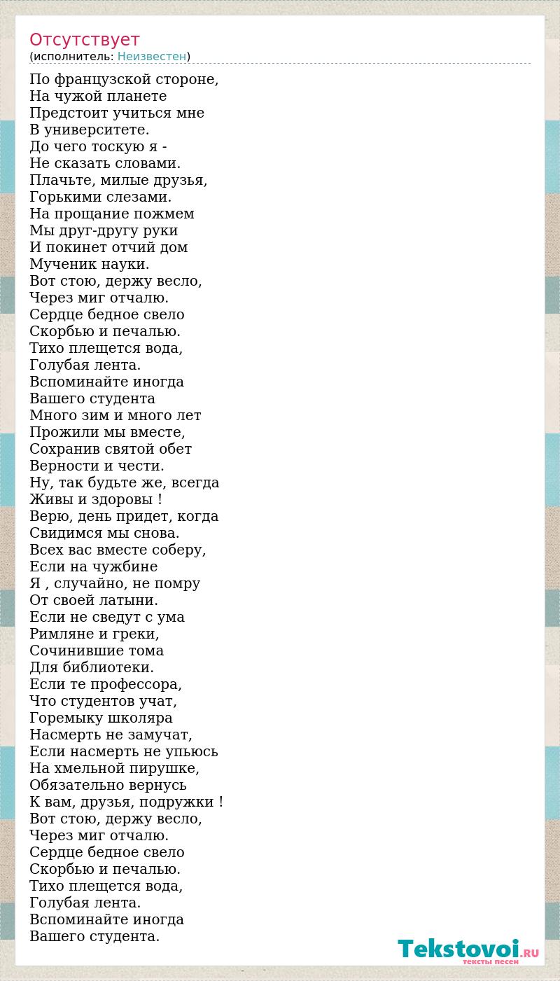 По французской стороне, На чужой планете Предстоит учиться мне В университете. До чего тоскую я - Не сказать словами. Плачьте, милые друзья, Горькими слезами. На прощание пожмем Мы друг-другу руки И покинет отчий дом Мученик науки. Вот стою, держу весло, Через миг отчалю. Сердце бедное свело Скорбью и печалью. Тихо плещется вода, Голубая лента. Вспоминайте иногда Вашего студента Много зим и много лет Прожили мы вместе, Сохранив святой обет Верности и чести. Ну, так будьте же, всегда Живы и здоровы ! Верю, день придет, когда Свидимся мы снова. Всех вас вместе соберу, Если на чужбине Я , случайно, не помру От своей латыни. Если не сведут с ума Римляне и греки, Сочинившие тома Для библиотеки. Если те профессора, Что студентов учат, Горемыку школяра Насмерть не замучат, Если насмерть не упьюсь На хмельной пирушке, Обязательно вернусь К вам, друзья, подружки ! Вот стою, держу весло, Через миг отчалю. Сердце бедное свело Скорбью и печалью. Тихо плещется вода, Голубая лента. Вспоминайте иногда Вашего студента.