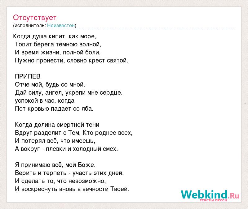 Когда душа кипит, как море, Топит берега тёмною волной, И время жизни, полной боли, Нужно пронести, словно крест святой. ПРИПЕВ Отче мой, будь со мной. Дай силу, ангел, укрепи мне сердце. успокой в час, когда Пот кровью падает со лба. Когда долина смертной тени Вдруг разделит с Тем, Кто роднее всех, И потерял всё, что имеешь, А вокруг - плевки и холодный смех. Я принимаю всё, мой Боже. Верить и терпеть - участь этих дней. И сделать то, что невозможно, И воскреснуть вновь в вечности Твоей.