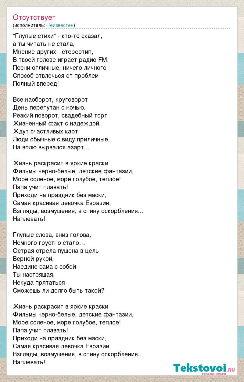 "Глупые стихи" - кто-то сказал, а ты читать не стала, Мнение других - стереотип, В твоей голове играет радио FM, Песни отличные, ничего личного Способ отвлечься от проблем Полный вперед! Все наоборот, круговорот День перепутан с ночью. Резкий поворот, свадебный торт Жизненный факт с надеждой. Ждут счастливых карт Люди обычные с виду приличные На волю вырвался азарт... Жизнь раскрасит в яркие краски Фильмы черно-белые, детские фантазии, Море соленое, море голубое, теплое! Папа учит плавать! Приходи на праздник без маски, Самая красивая девочка Евразии. Взгляды, возмущения, в спину оскорбления... Наплевать! Глупые слова, вниз голова, Немного грустно стало… Острая стрела пущена в цель Верной рукой, Наедине сама с собой - Ты настоящая, Некуда прятаться Сможешь ли долго быть такой? Жизнь раскрасит в яркие краски Фильмы черно-белые, детские фантазии, Море соленое, море голубое, теплое! Папа учит плавать! Приходи на праздник без маски, Самая красивая девочка Евразии. Взгляды, возмущения, в спину оскорбления... Наплевать!