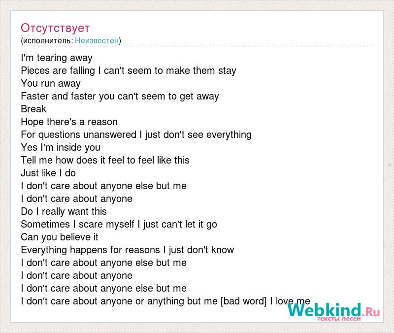 I'm tearing away Pieces are falling I can't seem to make them stay [bad word] away Faster and faster you can't seem to get away Break Hope there's a reason For questions unanswered I just don't see everything Yes I'm inside you Tell me how does it feel to feel like this Just like I do I don't care about anyone else but me I don't care about anyone Do I really want this Sometimes I scare myself I just can't let it go Can you believe it Everything happens for reasons I just don't know I don't care about anyone else but me I don't care about anyone I don't care about anyone else but me I don't care about anyone or anything but me [bad word] I love me
