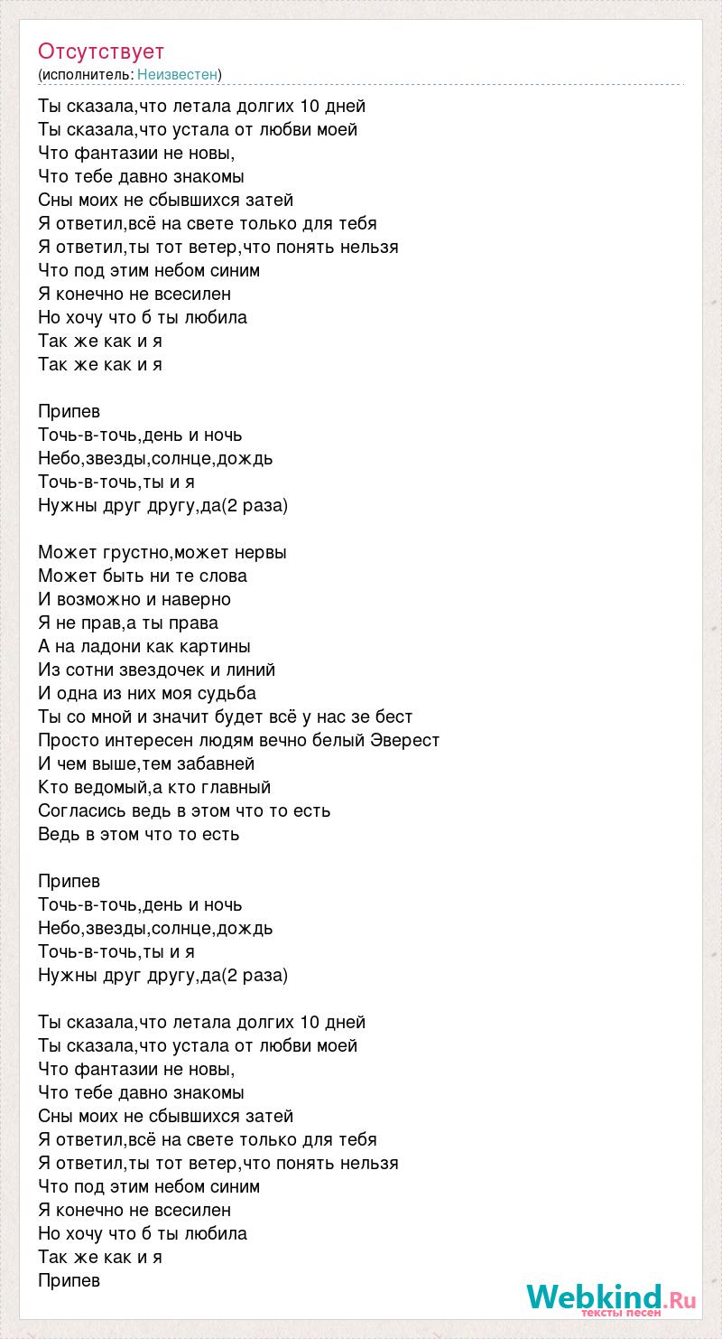 Ты сказала,что летала долгих 10 дней Ты сказала,что устала от любви моей Что фантазии не новы, Что тебе давно знакомы Сны моих не сбывшихся затей Я ответил,всё на свете только для тебя Я ответил,ты тот ветер,что понять нельзя Что под этим небом синим Я конечно не всесилен Но хочу что б ты любила Так же как и я Так же как и я Припев Точь-в-точь,день и ночь Небо,звезды,солнце,дождь Точь-в-точь,ты и я Нужны друг другу,да(2 раза) Может грустно,может нервы Может быть ни те слова И возможно и наверно Я не прав,а ты права А на ладони как картины Из сотни звездочек и линий И одна из них моя судьба Ты со мной и значит будет всё у нас зе бест Просто интересен людям вечно белый Эверест И чем выше,тем забавней Кто ведомый,а кто главный Согласись ведь в этом что то есть Ведь в этом что то есть Припев Точь-в-точь,день и ночь Небо,звезды,солнце,дождь Точь-в-точь,ты и я Нужны друг другу,да(2 раза) Ты сказала,что летала долгих 10 дней Ты сказала,что устала от любви моей Что фантазии не новы, Что тебе давно знакомы Сны моих не сбывшихся затей Я ответил,всё на свете только для тебя Я ответил,ты тот ветер,что понять нельзя Что под этим небом синим Я конечно не всесилен Но хочу что б ты любила Так же как и я Припев