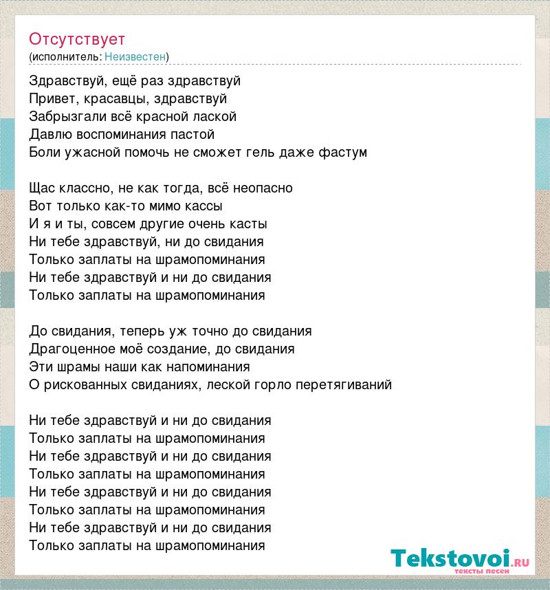 Здравствуй, ещё раз здравствуй Привет, красавцы, здравствуй Забрызгали всё красной лаской Давлю воспоминания пастой Боли ужасной помочь не сможет гель даже фастум Щас классно, не как тогда, всё неопасно Вот только как-то мимо кассы И я и ты, совсем другие очень касты Ни тебе здравствуй, ни до свидания Только заплаты на шрамопоминания Ни тебе здравствуй и ни до свидания Только заплаты на шрамопоминания До свидания, теперь уж точно до свидания Драгоценное моё создание, до свидания Эти шрамы наши как напоминания О рискованных свиданиях, леской горло перетягиваний Ни тебе здравствуй и ни до свидания Только заплаты на шрамопоминания Ни тебе здравствуй и ни до свидания Только заплаты на шрамопоминания Ни тебе здравствуй и ни до свидания Только заплаты на шрамопоминания Ни тебе здравствуй и ни до свидания Только заплаты на шрамопоминания