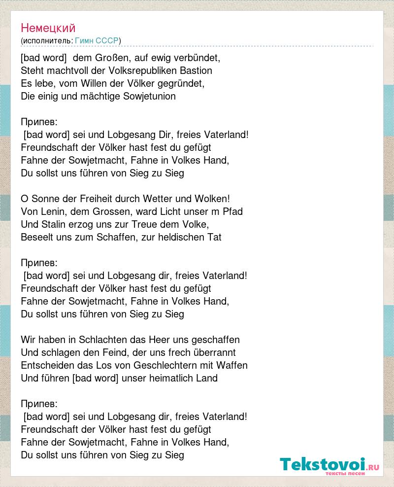 [bad word] dem Großen, auf ewig verbündet, Steht machtvoll der Volksrepubliken Bastion Es lebe, vom Willen der Völker gegründet, Die einig und mächtige Sowjetunion Припев: [bad word] sei und Lobgesang Dir, freies Vaterland! Freundschaft der Völker hast fest du gefügt Fahne der Sowjetmacht, Fahne in Volkes Hand, Du sollst uns führen von Sieg zu Sieg O Sonne der Freiheit durch Wetter und Wolken! Von Lenin, dem Grossen, ward Licht unser m Pfad Und Stalin erzog uns zur Treue dem Volke, Beseelt uns zum Schaffen, zur heldischen Tat Припев: [bad word] sei und Lobgesang dir, freies Vaterland! Freundschaft der Völker hast fest du gefügt Fahne der Sowjetmacht, Fahne in Volkes Hand, Du sollst uns führen von Sieg zu Sieg Wir haben in Schlachten das Heer uns geschaffen Und schlagen den Feind, der uns frech überrannt Entscheiden das Los von Geschlechtern mit Waffen Und führen [bad word] unser heimatlich Land Припев: [bad word] sei und Lobgesang dir, freies Vaterland! Freundschaft der Völker hast fest du gefügt Fahne der Sowjetmacht, Fahne in Volkes Hand, Du sollst uns führen von Sieg zu Sieg