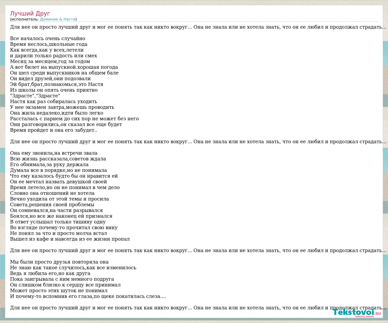 Для нее он просто лучший друг и мог ее понять так как никто вокруг... Она не знала или не хотела знать, что он ее любил и продолжал страдать... Все началось очень случайно Время неслось,школьные года Как всегда,как у всех,летели и дарили только радость или смех Месяц за месяцем,год за годом А вот билет на выпускной.хорошая погода Он шел среди выпускников на общем бале Он видел друзей,они подозвали Эй брат,брат,познакомься,это Настя Из школы он опять очень приятно "Здрасте","Здрасте" Настя как раз собиралась уходить У нее экзамен завтра,можешь проводить Она жила недалеко,идти было легко Рассталась с парнем до сих пор не может без него Они разговорились,он сказал все еще будет Время пройдет и она его забудет.. Для нее он просто лучший друг и мог ее понять так как никто вокруг... Она не знала или не хотела знать, что он ее любил и продолжал страдать... Она ему звонила,на встречи звала Всю жизнь рассказала,советов ждала Его обнимала,за руку держала Думала все в порядке,но не понимала Что ему казалось будто бы он нравится ей Он ее мечтал назвать девушкой своей Время летело,но он не понимал в чем дело Словно она отношений не хотела Вечно уходила от этой темы и просила Совета,решения своей проблемы Он сомневался,на части разрывался Боялся,но все же наконец ей признался В ответ услышал только тишину одну Во взгляде почему-то прочитал свою вину Не понял за что и просто молча встал Вышел из кафе и навсегда из ее жизни пропал Для нее он просто лучший друг и мог ее понять так как никто вокруг... Она не знала или не хотела знать, что он ее любил и продолжал страдать... Мы были просто друзья повторяла она Не знаю как такое случилось,как все изменилось Ведь я любила его,но как друга Пока заигрывала с ним немного подруга Он слишком близко к сердцу все принимал Может просто этих шуток не понимал И почему-то вспомнив его глаза,по щеке покатилась слеза.... Для нее он просто лучший друг и мог ее понять так как никто вокруг... Она не знала или не хотела знать, что он ее любил и продолжал страдать...