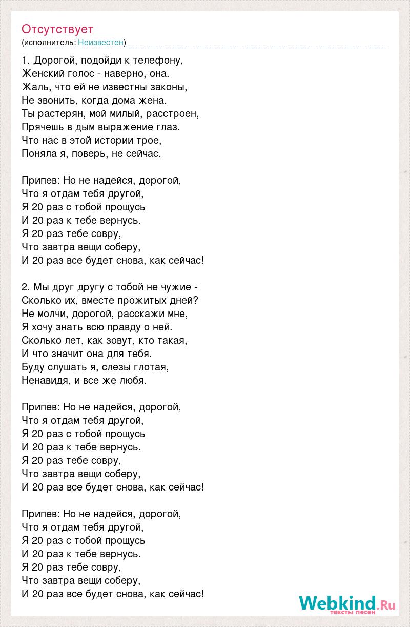 1. Дорогой, подойди к телефону, Женский голос - наверно, она. Жаль, что ей не известны законы, Не звонить, когда дома жена. Ты растерян, мой милый, расстроен, Прячешь в дым выражение глаз. Что нас в этой истории трое, Поняла я, поверь, не сейчас. Припев: Но не надейся, дорогой, Что я отдам тебя другой, Я 20 раз с тобой прощусь И 20 раз к тебе вернусь. Я 20 раз тебе совру, Что завтра вещи соберу, И 20 раз все будет снова, как сейчас! 2. Мы друг другу с тобой не чужие - Сколько их, вместе прожитых дней? Не молчи, дорогой, расскажи мне, Я хочу знать всю правду о ней. Сколько лет, как зовут, кто такая, И что значит она для тебя. Буду слушать я, слезы глотая, Ненавидя, и все же любя. Припев: Но не надейся, дорогой, Что я отдам тебя другой, Я 20 раз с тобой прощусь И 20 раз к тебе вернусь. Я 20 раз тебе совру, Что завтра вещи соберу, И 20 раз все будет снова, как сейчас! Припев: Но не надейся, дорогой, Что я отдам тебя другой, Я 20 раз с тобой прощусь И 20 раз к тебе вернусь. Я 20 раз тебе совру, Что завтра вещи соберу, И 20 раз все будет снова, как сейчас!
