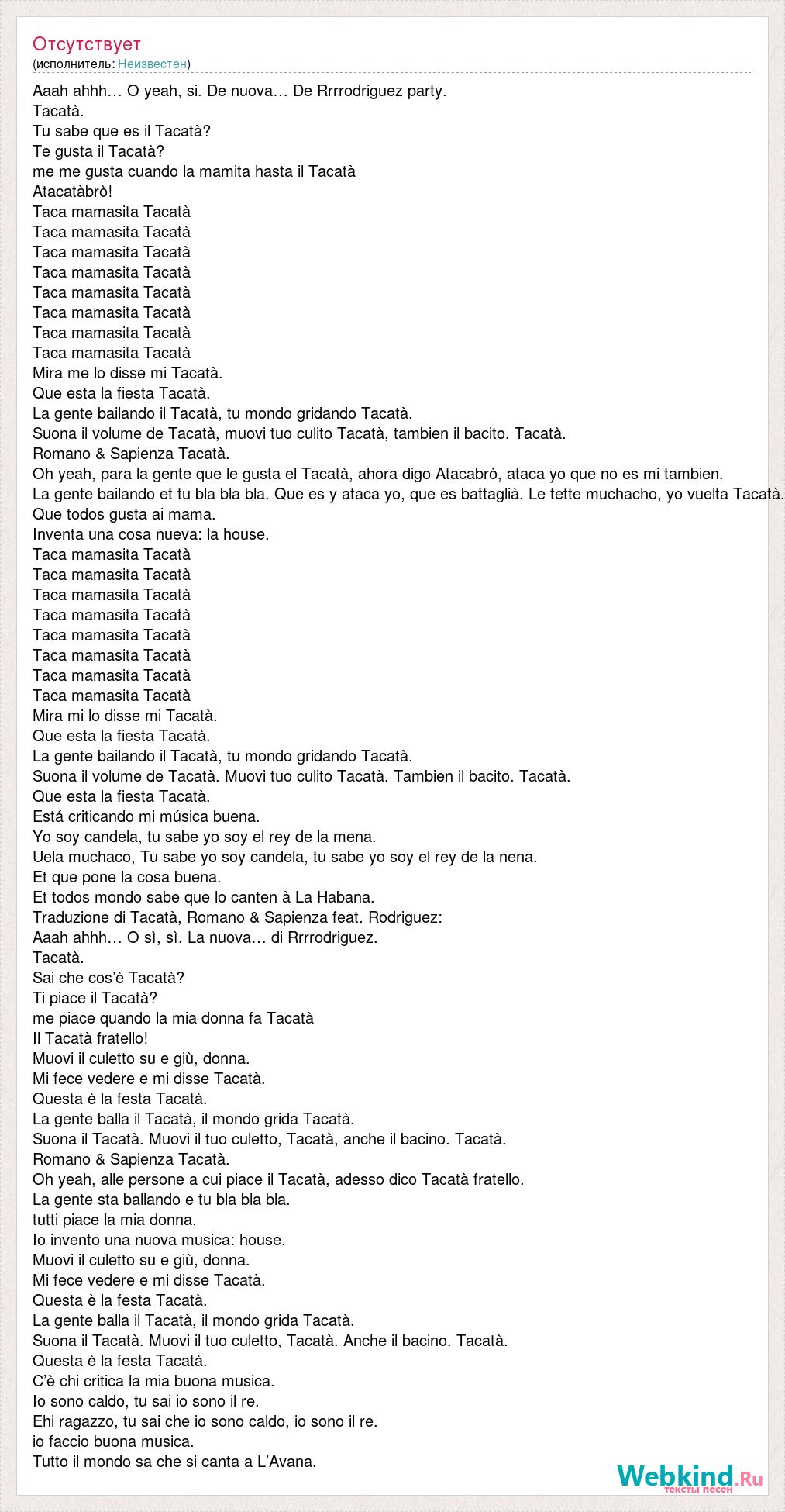 Suona il volume de Tacatà, muovi tuo culito Tacatà, tambien il bacito. Tacatà.