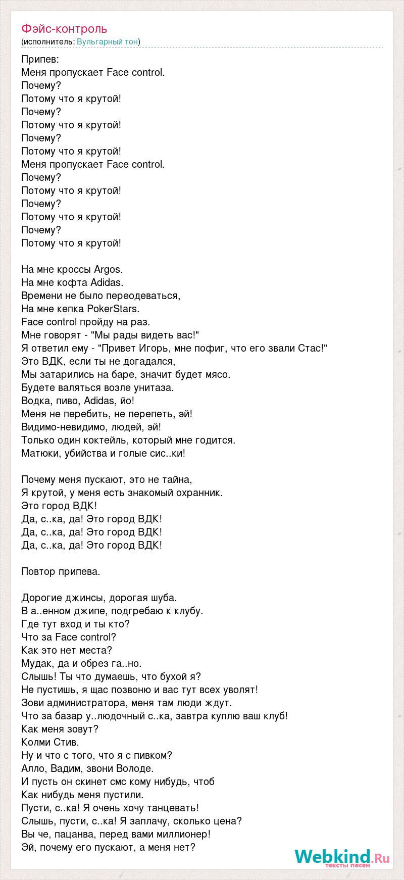 Припев: Меня пропускает Face control. Почему? Потому что я крутой! Почему? Потому что я крутой! Почему? Потому что я крутой! Меня пропускает Face control. Почему? Потому что я крутой! Почему? Потому что я крутой! Почему? Потому что я крутой! На мне кроссы Argos. На мне кофта Adidas. Времени не было переодеваться, На мне кепка PokerStars. Face control пройду на раз. Мне говорят - "Мы рады видеть вас!" Я ответил ему - "Привет Игорь, мне пофиг, что его звали Стас!" Это ВДК, если ты не догадался, Мы затарились на баре, значит будет мясо. Будете валяться возле унитаза. Водка, пиво, Adidas, йо! Меня не перебить, не перепеть, эй! Видимо-невидимо, людей, эй! Только один коктейль, который мне годится. Матюки, убийства и голые сис..ки! Почему меня пускают, это не тайна, Я крутой, у меня есть знакомый охранник. Это город ВДК! Да, с..ка, да! Это город ВДК! Да, с..ка, да! Это город ВДК! Да, с..ка, да! Это город ВДК! Повтор припева. Дорогие джинсы, дорогая шуба. В а..енном джипе, подгребаю к клубу. Где тут вход и ты кто? Что за Face control? Как это нет места? Мудак, да и обрез га..но. Слышь! Ты что думаешь, что бухой я? Не пустишь, я щас позвоню и вас тут всех уволят! Зови администратора, меня там люди ждут. Что за базар у..людочный с..ка, завтра куплю ваш клуб! Как меня зовут? Колми Стив. Ну и что с того, что я с пивком? Алло, Вадим, звони Володе. И пусть он скинет смс кому нибудь, чтоб Как нибудь меня пустили. Пусти, с..ка! Я очень хочу танцевать! Слышь, пусти, с..ка! Я заплачу, сколько цена? Вы че, пацанва, перед вами миллионер! Эй, почему его пускают, а меня нет?