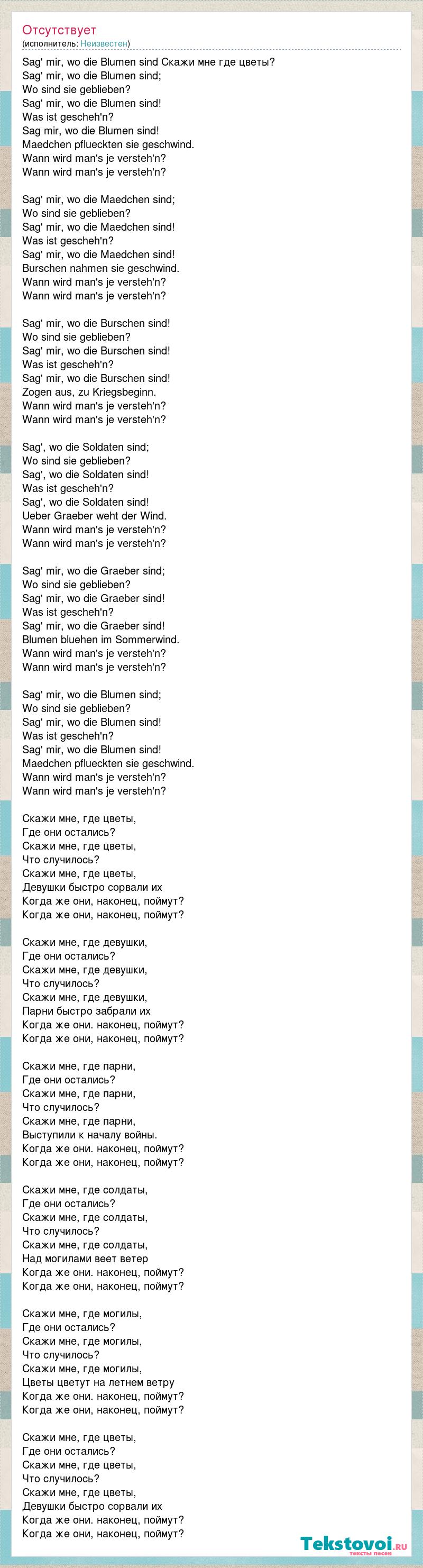 Sag' mir, wo die Blumen sind Скажи мне где цветы? Sag' mir, wo die Blumen sind; Wo sind sie geblieben? Sag' mir, wo die Blumen sind! Was ist gescheh'n? Sag mir, wo die Blumen sind! Maedchen pflueckten sie geschwind. Wann wird man's je versteh'n? Wann wird man's je versteh'n? Sag' mir, wo die Maedchen sind; Wo sind sie geblieben? Sag' mir, wo die Maedchen sind! Was ist gescheh'n? Sag' mir, wo die Maedchen sind! Burschen nahmen sie geschwind. Wann wird man's je versteh'n? Wann wird man's je versteh'n? Sag' mir, wo die Burschen sind! Wo sind sie geblieben? Sag' mir, wo die Burschen sind! Was ist gescheh'n? Sag' mir, wo die Burschen sind! Zogen aus, zu Kriegsbeginn. Wann wird man's je versteh'n? Wann wird man's je versteh'n? Sag', wo die Soldaten sind; Wo sind sie geblieben? Sag', wo die Soldaten sind! Was ist gescheh'n? Sag', wo die Soldaten sind! Ueber Graeber weht der Wind. Wann wird man's je versteh'n? Wann wird man's je versteh'n? Sag' mir, wo die Graeber sind; Wo sind sie geblieben? Sag' mir, wo die Graeber sind! Was ist gescheh'n? Sag' mir, wo die Graeber sind! Blumen bluehen im Sommerwind. Wann wird man's je versteh'n? Wann wird man's je versteh'n? Sag' mir, wo die Blumen sind; Wo sind sie geblieben? Sag' mir, wo die Blumen sind! Was ist gescheh'n? Sag' mir, wo die Blumen sind! Maedchen pflueckten sie geschwind. Wann wird man's je versteh'n? Wann wird man's je versteh'n? Скажи мне, где цветы, Где они остались? Скажи мне, где цветы, Что случилось? Скажи мне, где цветы, Девушки быстро сорвали их Когда же они, наконец, поймут? Когда же они, наконец, поймут? Скажи мне, где девушки, Где они остались? Скажи мне, где девушки, Что случилось? Скажи мне, где девушки, Парни быстро забрали их Когда же они. наконец, поймут? Когда же они, наконец, поймут? Скажи мне, где парни, Где они остались? Скажи мне, где парни, Что случилось? Скажи мне, где парни, Выступили к началу войны. Когда же они. наконец, поймут? Когда же они, наконец, поймут? Скажи мне, где солдаты, Где они остались? Скажи мне, где солдаты, Что случилось? Скажи мне, где солдаты, Над могилами веет ветер Когда же они. наконец, поймут? Когда же они, наконец, поймут? Скажи мне, где могилы, Где они остались? Скажи мне, где могилы, Что случилось? Скажи мне, где могилы, Цветы цветут на летнем ветру Когда же они. наконец, поймут? Когда же они, наконец, поймут? Скажи мне, где цветы, Где они остались? Скажи мне, где цветы, Что случилось? Скажи мне, где цветы, Девушки быстро сорвали их Когда же они. наконец, поймут? Когда же они, наконец, поймут?