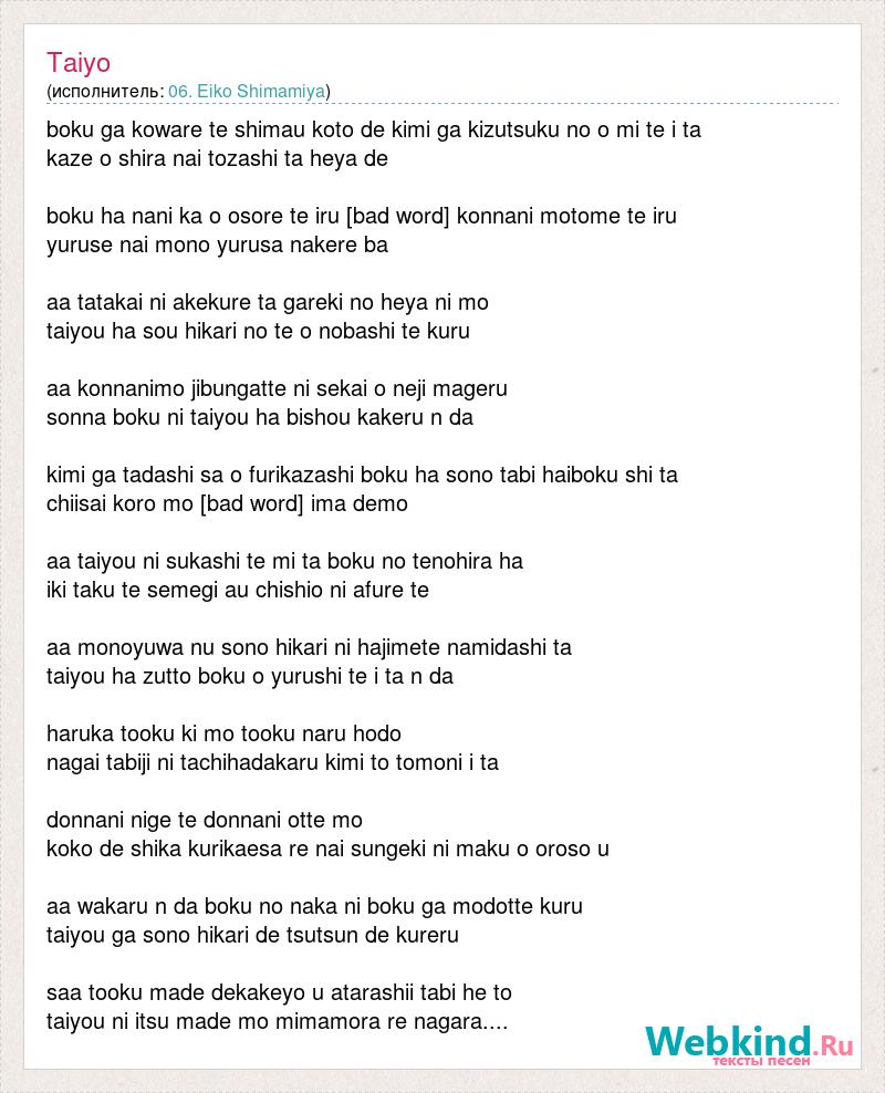 boku ga koware te shimau koto de kimi ga kizutsuku no o mi te i ta kaze o shira nai tozashi ta heya de boku ha nani ka o osore te [bad word] [bad word] konnani motome te [bad word] yuruse nai mono [bad word] nakere ba aa tatakai ni akekure ta gareki no heya ni mo taiyou ha sou hikari no te o nobashi te [bad word] aa konnanimo jibungatte ni sekai o neji [bad word] sonna boku ni taiyou ha bishou [bad word] n da kimi ga tadashi sa o furikazashi boku ha sono tabi haiboku shi ta chiisai koro mo [bad word] ima demo aa taiyou ni sukashi te mi ta boku no tenohira ha iki taku te semegi au chishio ni afure te aa monoyuwa nu sono hikari ni hajimete namidashi ta taiyou ha zutto boku o [bad word] te i ta n da [bad word] tooku ki mo tooku [bad word] hodo nagai tabiji ni [bad word] kimi to tomoni i ta donnani nige te donnani otte mo koko de shika kurikaesa re nai sungeki ni maku o oroso u aa [bad word] n da boku no naka ni boku ga modotte [bad word] taiyou ga sono hikari de tsutsun de [bad word] saa tooku made dekakeyo u atarashii tabi he to taiyou ni itsu made mo mimamora re nagara....