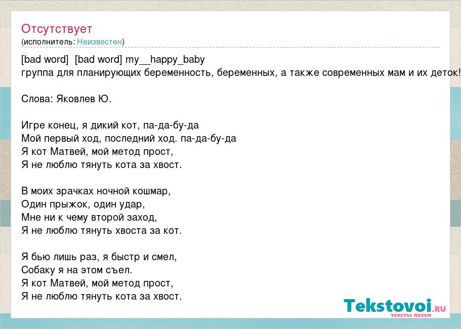 [bad word] [bad word] my__happy_baby группа для планирующих беременность, беременных, а также современных мам и их деток! Слова: Яковлев Ю. Игре конец, я дикий кот, па-да-бу-да Мой первый ход, последний ход. па-да-бу-да Я кот Матвей, мой метод прост, Я не люблю тянуть кота за хвост. В моих зрачках ночной кошмар, Один прыжок, один удар, Мне ни к чему второй заход, Я не люблю тянуть хвоста за кот. Я бью лишь раз, я быстр и смел, Собаку я на этом съел. Я кот Матвей, мой метод прост, Я не люблю тянуть кота за хвост.