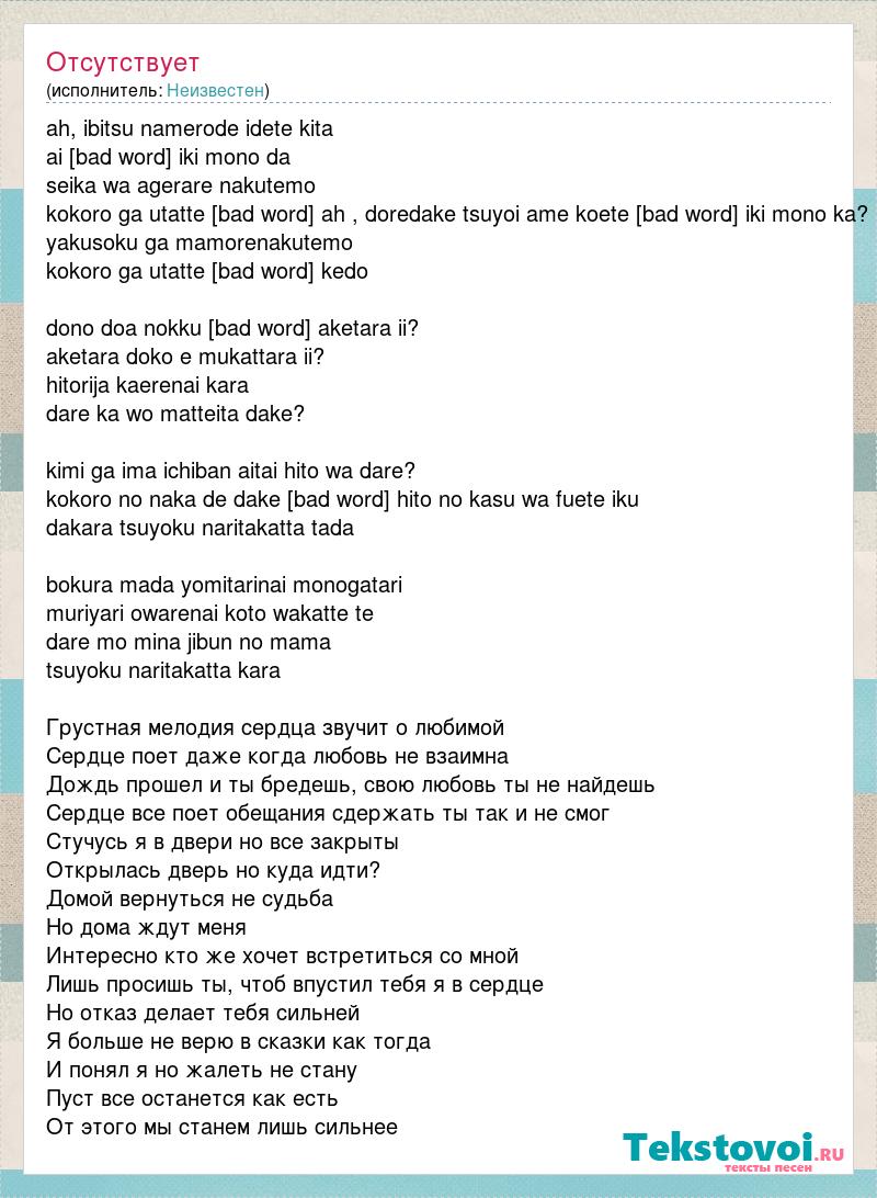 ah, ibitsu namerode idete kita ai [bad word] iki mono da seika wa agerare nakutemo kokoro ga utatte [bad word] ah , doredake tsuyoi ame koete [bad word] iki mono ka? yakusoku ga mamorenakutemo kokoro ga utatte [bad word] kedo dono doa nokku [bad word] aketara ii? aketara doko e mukattara ii? hitorija kaerenai kara dare ka wo matteita dake? kimi ga ima ichiban aitai hito wa dare? kokoro no naka de dake [bad word] hito no kasu wa fuete iku dakara tsuyoku naritakatta tada bokura mada yomitarinai monogatari muriyari owarenai koto wakatte te dare mo mina jibun no mama tsuyoku naritakatta kara Грустная мелодия сердца звучит о любимой Сердце поет даже когда любовь не взаимна Дождь прошел и ты бредешь, свою любовь ты не найдешь Сердце все поет обещания сдержать ты так и не смог Стучусь я в двери но все закрыты Открылась дверь но куда идти? Домой вернуться не судьба Но дома ждут меня Интересно кто же хочет встретиться со мной Лишь просишь ты, чтоб впустил тебя я в сердце Но отказ делает тебя сильней Я больше не верю в сказки как тогда И понял я но жалеть не стану Пуст все останется как есть От этого мы станем лишь сильнее