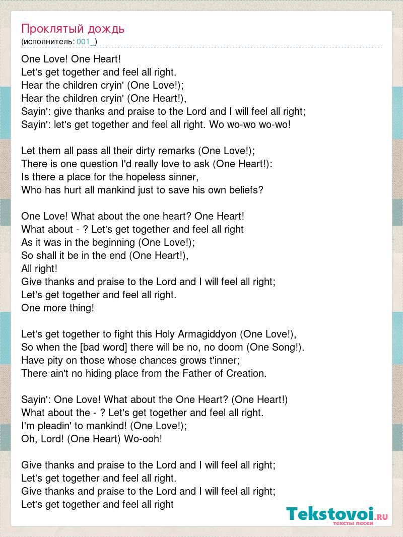 One Love! One Heart! Let's get together and feel all right. Hear the children cryin' (One Love!); Hear the children cryin' (One Heart!), Sayin': give thanks and praise to the Lord and I will feel all right; Sayin': let's get together and feel all right. Wo wo-wo wo-wo! Let them all pass all their dirty remarks (One Love!); There is one question I'd really love to ask (One Heart!): Is there a place for the hopeless sinner, Who has hurt all mankind just to save his own beliefs? One Love! What about the one heart? One Heart! What about - ? Let's get together and feel all right As it was in the beginning (One Love!); So shall it be in the end (One Heart!), All right! Give thanks and praise to the Lord and I will feel all right; Let's get together and feel all right. One more thing! Let's get together to fight this Holy Armagiddyon (One Love!), So when the [bad word] there will be no, no doom (One Song!). Have pity on those whose chances grows t'inner; There ain't no hiding place from the Father of Creation. Sayin': One Love! What about the One Heart? (One Heart!) What about the - ? Let's get together and feel all right. I'm pleadin' to mankind! (One Love!); Oh, Lord! (One Heart) Wo-ooh! Give thanks and praise to the Lord and I will feel all right; Let's get together and feel all right. Give thanks and praise to the Lord and I will feel all right; Let's get together and feel all right
