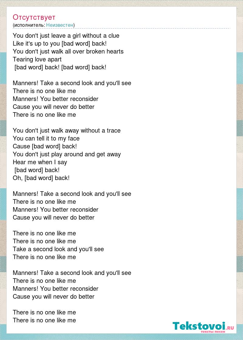 You don't just leave a girl without a clue Like it's up to you [bad word] back! You don't just walk all over broken hearts Tearing love apart [bad word] back! [bad word] back! Manners! Take a second look and you'll see There is no one like me Manners! You better reconsider Cause you will never do better There is no one like me You don't just walk away without a trace You can tell it to my face Cause [bad word] back! You don't just play around and get away Hear me when I say [bad word] back! Oh, [bad word] back! Manners! Take a second look and you'll see There is no one like me Manners! You better reconsider Cause you will never do better There is no one like me There is no one like me Take a second look and you'll see There is no one like me Manners! Take a second look and you'll see There is no one like me Manners! You better reconsider Cause you will never do better There is no one like me There is no one like me