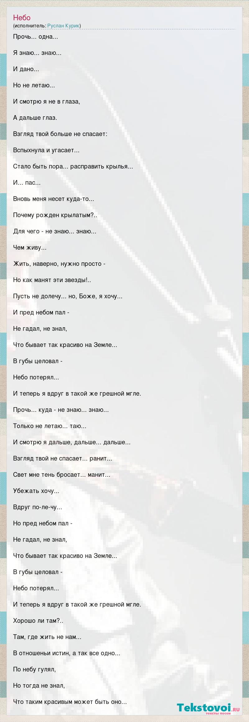 Прочь... одна... Я знаю... знаю... И дано... Но не летаю... И смотрю я не в глаза, А дальше глаз. Взгляд твой больше не спасает: Вспыхнула и угасает... Стало быть пора... расправить крылья... И... пас... Вновь меня несет куда-то... Почему рожден крылатым?.. Для чего - не знаю... знаю... Чем живу... Жить, наверно, нужно просто - Но как манят эти звезды!.. Пусть не долечу... но, Боже, я хочу... И пред небом пал - Не гадал, не знал, Что бывает так красиво на Земле... В губы целовал - Небо потерял... И теперь я вдруг в такой же грешной мгле. Прочь... куда - не знаю... знаю... Только не летаю... таю... И смотрю я дальше, дальше... дальше... Взгляд твой не спасает... ранит... Свет мне тень бросает... манит... Убежать хочу... Вдруг по-ле-чу... Но пред небом пал - Не гадал, не знал, Что бывает так красиво на Земле... В губы целовал - Небо потерял... И теперь я вдруг в такой же грешной мгле. Хорошо ли там?.. Там, где жить не нам... В отношеньи истин, а так все одно... По небу гулял, Но тогда не знал, Что таким красивым может быть оно...