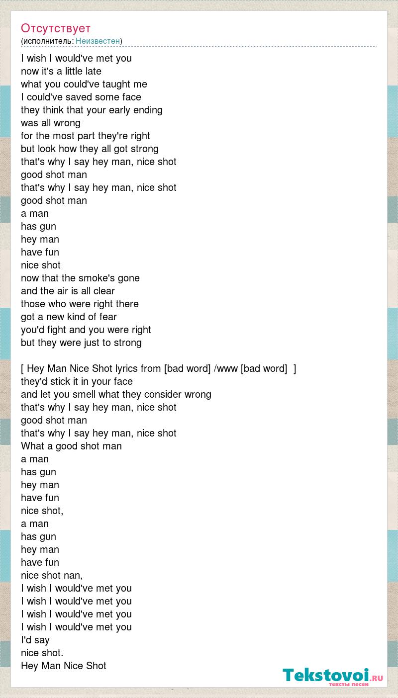 I wish I would've met you now it's a little late what you could've taught me I could've saved some face they think that your early ending was all wrong for the most part they're right but look how they all got strong that's why I say hey man, nice shot good shot man that's why I say hey man, nice shot good shot man a man has gun hey man have fun nice shot now that the smoke's gone and the air is all clear those who were right there got a new kind of fear you'd fight and you were right but they were just to strong [ Hey Man Nice Shot lyrics from [bad word] /www [bad word] ] they'd stick it in your face and let you smell what they consider wrong that's why I say hey man, nice shot good shot man that's why I say hey man, nice shot What a good shot man a man has gun hey man have fun nice shot, a man has gun hey man have fun nice shot nan, I wish I would've met you I wish I would've met you I wish I would've met you I wish I would've met you I'd say nice shot. Hey Man Nice Shot