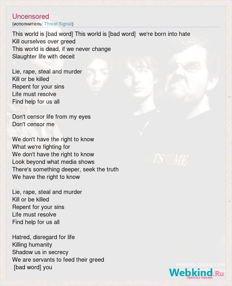 This world is [bad word] This world is [bad word] we're born into hate Kill ourselves over greed This world is dead, if we never change Slaughter life with deceit Lie, rape, steal and murder Kill or be killed Repent for your sins Life must resolve Find help for us all Don't censor life from my eyes Don't censor me We don't have the right to know What we're fighting for We don't have the right to know Look beyond what media shows There's something deeper, seek the [bad word] We have the right to know Lie, rape, steal and murder Kill or be killed Repent for your sins Life must resolve Find help for us all Hatred, disregard for life Killing humanity Shadow us in secrecy We are servants to feed their greed [bad word] you