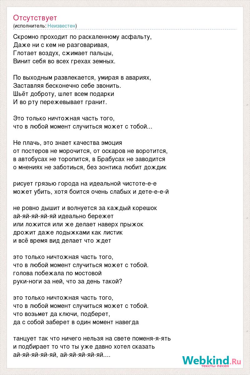 Скромно проходит по раскаленному асфальту, Даже ни с кем не разговаривая, Глотает воздух, сжимает пальцы, Винит себя во всех грехах земных. По выходным развлекается, умирая в авариях, Заставляя бесконечно себе звонить. Шьёт доброту, шлет всем подарки И во рту пережевывает гранит. Это только ничтожная часть того, что в любой момент случиться может с тобой... Не плачь, это знает качества эмоция от постеров не морочится, от оскаров не воротится, в автобусах не торопится, в Брабусах не заводится о мнениях не заботиься, без зонтика любит дождик рисует грязью города на идеальной чистоте-е-е может убить, хотя боится очень слабых и дете-е-е-й не ровно дышит и волнуется за каждый корешок ай-яй-яй-яй-яй идеально бережет или ложится или же делает наверх прыжок дрожит даже лодыжками как листик и всё время вид делает что ждет это только ничтожная часть того, что в любой момент случиться может с тобой. голова побежала по мостовой руки-ноги за ней, что за день такой? это только ничтожная часть того, что в любой момент случиться может с тобой. что возьмет да ключи, подберет, да с собой заберет в один момент навегда танцует так что ничего нельзя на свете поменя-я-ять и подбирает то что ты уже давно хотел сказать ай-яй-яй-яй-яй, ай-яй-яй-яй-яй....