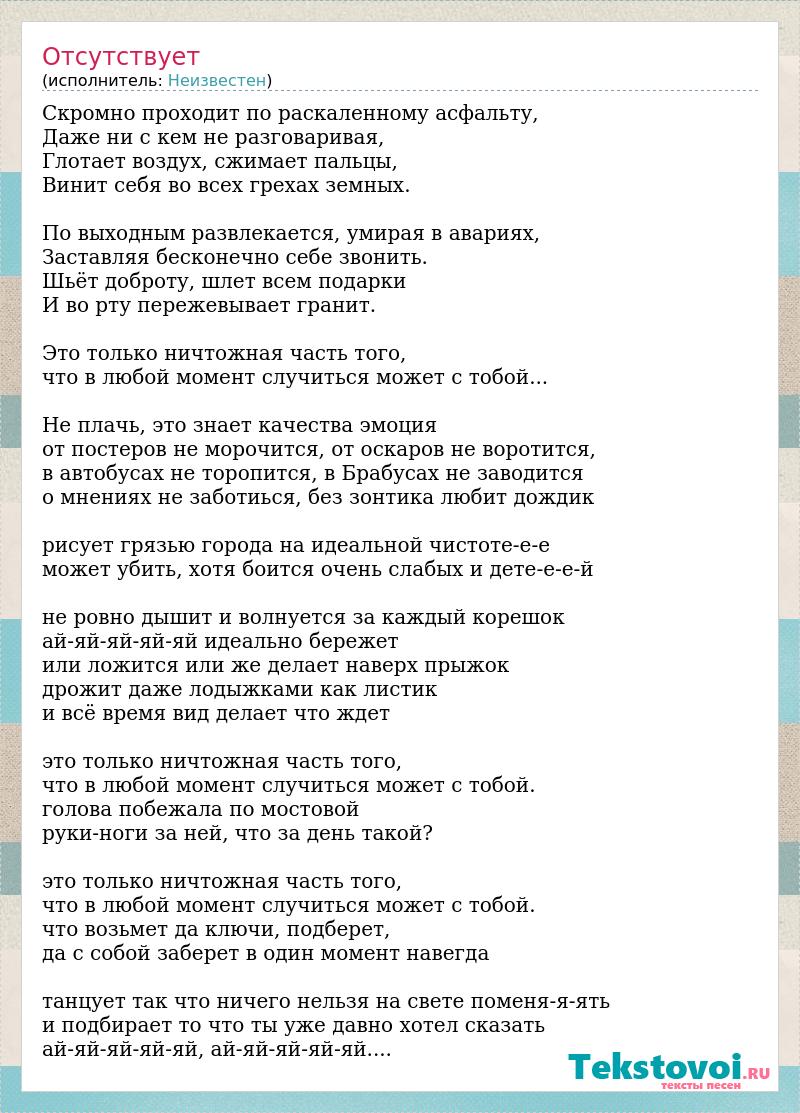 Скромно проходит по раскаленному асфальту, Даже ни с кем не разговаривая, Глотает воздух, сжимает пальцы, Винит себя во всех грехах земных. По выходным развлекается, умирая в авариях, Заставляя бесконечно себе звонить. Шьёт доброту, шлет всем подарки И во рту пережевывает гранит. Это только ничтожная часть того, что в любой момент случиться может с тобой... Не плачь, это знает качества эмоция от постеров не морочится, от оскаров не воротится, в автобусах не торопится, в Брабусах не заводится о мнениях не заботиься, без зонтика любит дождик рисует грязью города на идеальной чистоте-е-е может убить, хотя боится очень слабых и дете-е-е-й не ровно дышит и волнуется за каждый корешок ай-яй-яй-яй-яй идеально бережет или ложится или же делает наверх прыжок дрожит даже лодыжками как листик и всё время вид делает что ждет это только ничтожная часть того, что в любой момент случиться может с тобой. голова побежала по мостовой руки-ноги за ней, что за день такой? это только ничтожная часть того, что в любой момент случиться может с тобой. что возьмет да ключи, подберет, да с собой заберет в один момент навегда танцует так что ничего нельзя на свете поменя-я-ять и подбирает то что ты уже давно хотел сказать ай-яй-яй-яй-яй, ай-яй-яй-яй-яй....