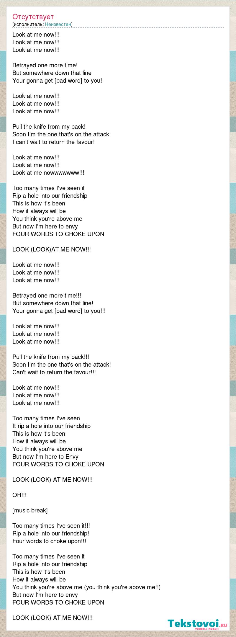 Look at me now!!! Look at me now!!! Look at me now!!! Betrayed one more time! But somewhere down that line Your gonna get [bad word] to you! Look at me now!!! Look at me now!!! Look at me now!!! Pull the knife from my back! Soon I'm the one that's on the attack I can't wait to return the favour! Look at me now!!! Look at me now!!! Look at me nowwwwwww!!! Too many times I've seen it Rip a hole into our friendship This is how it's been How it always will be You think you're above me But now I'm here to envy FOUR WORDS TO CHOKE UPON LOOK (LOOK)AT ME NOW!!! Look at me now!!! Look at me now!!! Look at me now!!! Betrayed one more time!!! But somewhere down that line! Your gonna get [bad word] to you!!! Look at me now!!! Look at me now!!! Look at me now!!! Pull the knife from my back!!! Soon I'm the one that's on the attack! Can't wait to return the favour!!! Look at me now!!! Look at me now!!! Look at me now!!! Too many times I've seen It rip a hole into our friendship This is how it's been How it always will be You think you're above me But now I'm here to Envy FOUR WORDS TO CHOKE UPON LOOK (LOOK) AT ME NOW!!! OH!!! [music break] Too many times I've seen it!!! Rip a hole into our friendship! Four words to choke upon!!! Too many times I've seen it Rip a hole into our friendship This is how it's been How it always will be You think you're above me (you think you're above me!!) But now I'm here to envy FOUR WORDS TO CHOKE UPON LOOK (LOOK) AT ME NOW!!!