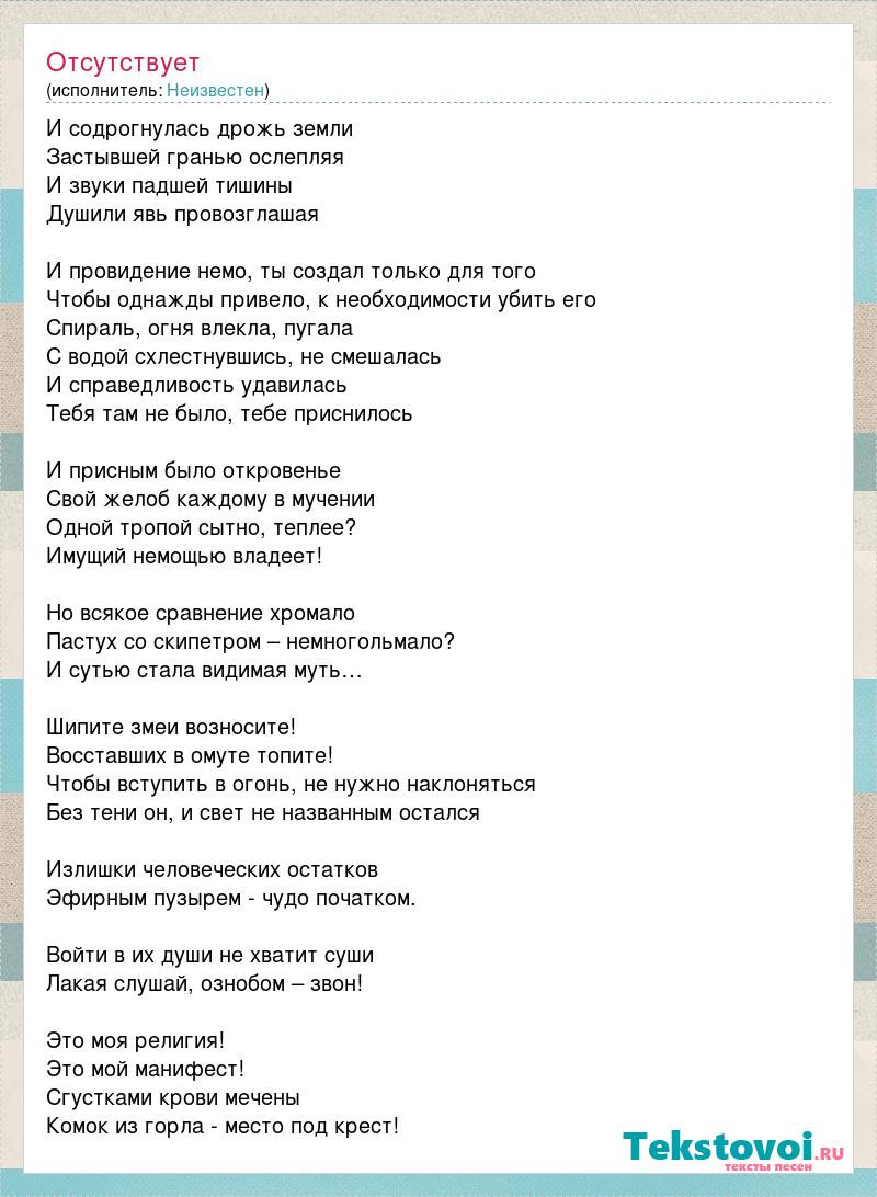 И содрогнулась дрожь земли Застывшей гранью ослепляя И звуки падшей тишины Душили явь провозглашая И провидение немо, ты создал только для того Чтобы однажды привело, к необходимости убить его Спираль, огня влекла, пугала С водой схлестнувшись, не смешалась И справедливость удавилась Тебя там не было, тебе приснилось И присным было откровенье Свой желоб каждому в мучении Одной тропой сытно, теплее? Имущий немощью владеет! Но всякое сравнение хромало Пастух со скипетром – немногольмало? И сутью стала видимая муть… Шипите змеи возносите! Восставших в омуте топите! Чтобы вступить в огонь, не нужно наклоняться Без тени он, и свет не названным остался Излишки человеческих остатков Эфирным пузырем - чудо початком. Войти в их души не хватит суши Лакая слушай, ознобом – звон! Это моя религия! Это мой манифест! Сгустками крови мечены Комок из горла - место под крест!