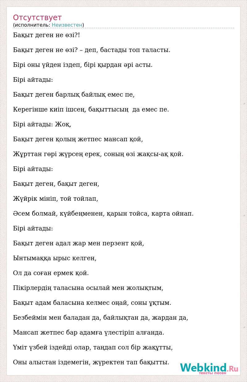 Бақыт деген не өзі?! Бақыт деген не өзі? – деп, бастады топ таласты. Бірі оны үйден іздеп, бірі қырдан әрі асты. Бірі айтады: Бақыт деген барлық байлық емес пе, Керегінше киіп ішсең, бақыттысың да емес пе. Бірі айтады: Жоқ, Бақыт деген қолың жетпес мансап қой, Жұрттан гөрі жүрсең ерек, соның өзі жақсы-ақ қой. Бірі айтады: Бақыт деген, бақыт деген, Жүйрік мініп, той тойлап, Әсем болмай, күйбеңменен, қарын тойса, карта ойнап. Бірі айтады: Бақыт деген адал жар мен перзент қой, Ынтымаққа ырыс келген, Ол да соған ермек қой. Пікірлердің таласына осылай мен жолықтым, Бақыт адам баласына келмес оңай, соны ұқтым. Безбеймін мен баладан да, байлықтан да, жардан да, Мансап жетпес бар адамға үлестіріп алғанда. Үміт үзбей іздейді олар, таңдап сол бір жақұтты, Оны алыстан іздемегін, жүректен тап бақытты.