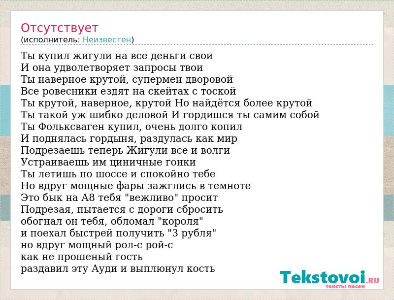 Ты купил жигули на все деньги свои И она удволетворяет запросы твои Ты наверное крутой, супермен дворовой Все ровесники ездят на скейтах с тоской Ты крутой, наверное, крутой Но найдётся более крутой Ты такой уж шибко деловой И гордишся ты самим собой Ты Фольксваген купил, очень долго копил И поднялась гордыня, раздулась как мир Подрезаешь теперь Жигули все и волги Устраиваешь им циничные гонки Ты летишь по шоссе и спокойно тебе Но вдруг мощные фары зажглись в темноте Это бык на А8 тебя "вежливо" просит Подрезая, пытается с дороги сбросить обогнал он тебя, обломал "короля" и поехал быстрей получить "3 рубля" но вдруг мощный рол-с рой-с как не прошеный гость раздавил эту Ауди и выплюнул кость