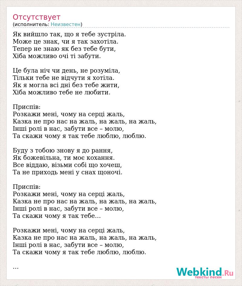 Як вийшло так, що я тебе зустріла. Може це знак, чи я так захотіла. Тепер не знаю як без тебе бути, Хіба можливо очі ті забути. Це була ніч чи день, не розуміла, Тільки тебе не відчути я хотіла. Як я могла всі дні без тебе жити, Хіба можливо тебе не любити. Приспів: Розкажи мені, чому на серці жаль, Казка не про нас на жаль, на жаль, на жаль, Інші ролі в нас, забути все – молю, Та скажи чому я так тебе люблю, люблю. Буду з тобою знову я до рання, Як божевільна, ти моє кохання. Все віддаю, візьми собі що хочеш, Та не приходь мені у снах щоночі. Приспів: Розкажи мені, чому на серці жаль, Казка не про нас на жаль, на жаль, на жаль, Інші ролі в нас, забути все – молю, Та скажи чому я так тебе… Розкажи мені, чому на серці жаль, Казка не про нас на жаль, на жаль, на жаль, Інші ролі в нас, забути все – молю, Та скажи чому я так тебе люблю, люблю. …