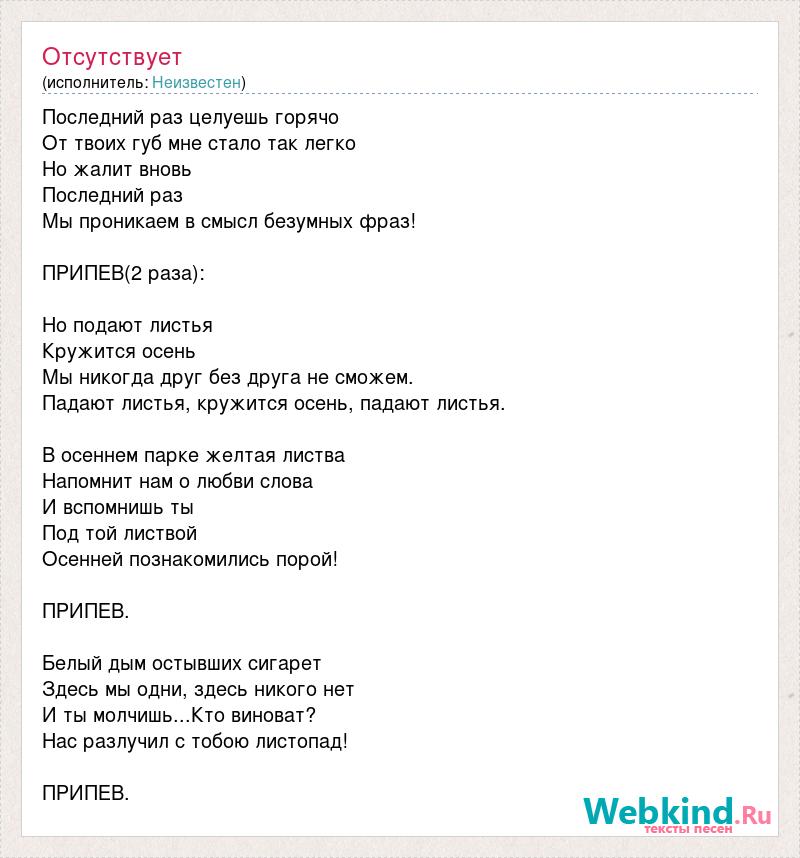 Последний раз целуешь горячо От твоих губ мне стало так легко Но жалит вновь Последний раз Мы проникаем в смысл безумных фраз! ПРИПЕВ(2 раза): Но подают листья Кружится осень Мы никогда друг без друга не сможем. Падают листья, кружится осень, падают листья. В осеннем парке желтая листва Напомнит нам о любви слова И вспомнишь ты Под той листвой Осенней познакомились порой! ПРИПЕВ. Белый дым остывших сигарет Здесь мы одни, здесь никого нет И ты молчишь...Кто виноват? Нас разлучил с тобою листопад! ПРИПЕВ.