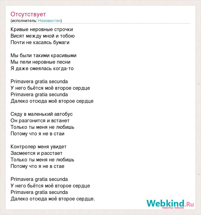 Кривые неровные строчки Висят между мной и тобою Почти не касаясь бумаги Мы были такими красивыми Мы пели неровные песни Я даже смеялась когда-то Primavera gratia secunda У него бьётся моё второе сердце Primavera gratia secunda Далеко отсюда моё второе сердце Сяду в маленький автобус Он разгонится и встанет Только ты меня не любишь Потому что я не в стаи Контролер меня увидет Засмеется и расстает Только ты меня не любишь Потому что я не в стае Primavera gratia secunda У него бьётся моё второе сердце Primavera gratia secunda Далеко отсюда моё второе сердце.