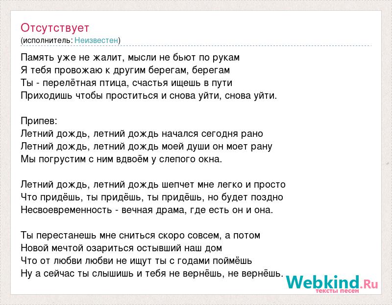 Память уже не жалит, мысли не бьют по рукам Я тебя провожаю к другим берегам, берегам Ты - перелётная птица, счастья ищешь в пути Приходишь чтобы проститься и снова уйти, снова уйти. Припев: Летний дождь, летний дождь начался сегодня рано Летний дождь, летний дождь моей души он моет рану Мы погрустим с ним вдвоём у слепого окна. Летний дождь, летний дождь шепчет мне легко и просто Что придёшь, ты придёшь, ты придёшь, но будет поздно Несвоевременность - вечная драма, где есть он и она. Ты перестанешь мне сниться скоро совсем, а потом Новой мечтой озариться остывший наш дом Что от любви любви не ищут ты с годами поймёшь Ну а сейчас ты слышишь и тебя не вернёшь, не вернёшь.