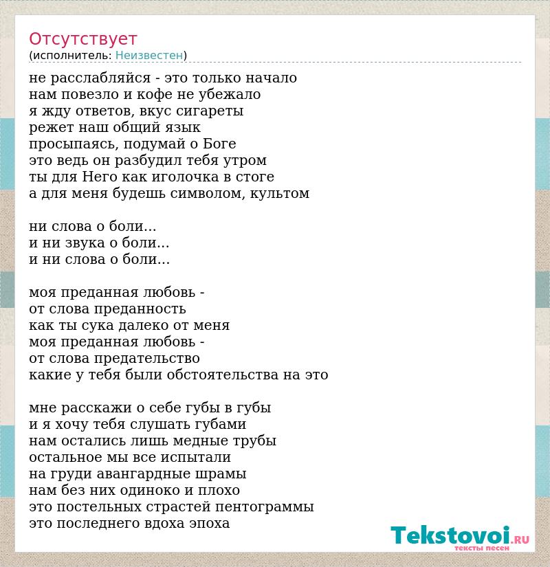 не расслабляйся - это только начало нам повезло и кофе не убежало я жду ответов, вкус сигареты режет наш общий язык просыпаясь, подумай о Боге это ведь он разбудил тебя утром ты для Него как иголочка в стоге а для меня будешь символом, культом ни слова о боли... и ни звука о боли... и ни слова о боли... моя преданная любовь - от слова преданность как ты сука далеко от меня моя преданная любовь - от слова предательство какие у тебя были обстоятельства на это мне расскажи о себе губы в губы и я хочу тебя слушать губами нам остались лишь медные трубы остальное мы все испытали на груди авангардные шрамы нам без них одиноко и плохо это постельных страстей пентограммы это последнего вдоха эпоха