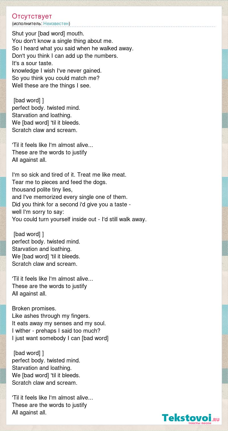 Shut your [bad word] mouth. You don't know a single thing about me. So I heard what you said when he walked away. Don't you think I can add up the numbers. It's a sour taste. knowledge I wish I've never gained. So you think you could match me? Well these are the things I see. [bad word] ] perfect body. twisted mind. Starvation and loathing. We [bad word] 'til it bleeds. Scratch claw and scream. 'Til it feels like I'm almost alive... These are the words to justify All against all. I'm so sick and tired of it. Treat me like meat. Tear me to pieces and feed the dogs. thousand polite tiny lies, and I've memorized every single one of them. Did you think for a second i'd give you a taste - well I'm sorry to say: You could turn yourself inside out - I'd still walk away. [bad word] ] perfect body. twisted mind. Starvation and loathing. We [bad word] 'til it bleeds. Scratch claw and scream. 'Til it feels like I'm almost alive... These are the words to justify All against all. Broken promises. Like ashes through my fingers. It eats away my senses and my soul. I wither - prehaps I said too much? I just want somebody I can [bad word] [bad word] ] perfect body. twisted mind. Starvation and loathing. We [bad word] 'til it bleeds. Scratch claw and scream. 'Til it feels like I'm almost alive... These are the words to justify All against all.