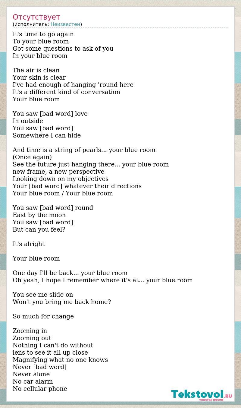 It's time to go again To your blue room Got some questions to ask of you In your blue room The air is clean Your skin is clear I've had enough of hanging 'round here It's a different kind of conversation Your blue room You saw [bad word] love In outside You saw [bad word] Somewhere I can hide And time is a string of pearls... your blue room (Once again) See the future just hanging there... your blue room new frame, a new perspective Looking down on my objectives Your [bad word] whatever their directions Your blue room / Your blue room You saw [bad word] round East by the moon You saw [bad word] But can you feel? It's alright Your blue room One day I'll be back... your blue room Oh yeah, I hope I remember where it's at... your blue room You see me slide on Won't you bring me back home? So much for change Zooming in Zooming out Nothing I can't do without lens to see it all up close Magnifying what no one knows Never [bad word] Never alone No car alarm No cellular phone