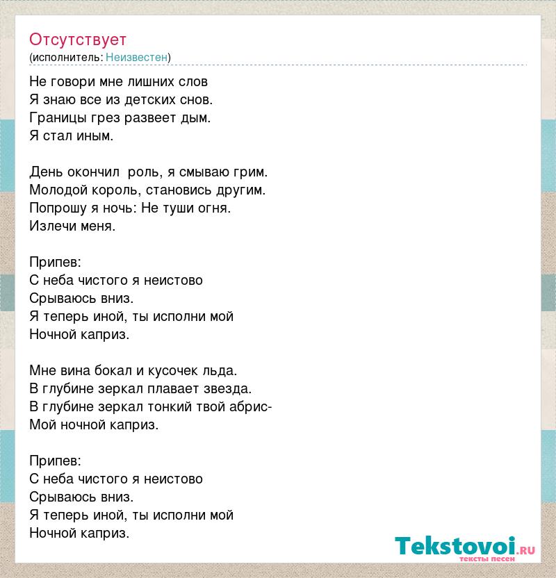 Не говори мне лишних слов Я знаю все из детских снов. Границы грез развеет дым. Я стал иным. День окончил роль, я смываю грим. Молодой король, становись другим. Попрошу я ночь: Не туши огня. Излечи меня. Припев: С неба чистого я неистово Срываюсь вниз. Я теперь иной, ты исполни мой Ночной каприз. Мне вина бокал и кусочек льда. В глубине зеркал плавает звезда. В глубине зеркал тонкий твой абрис- Мой ночной каприз. Припев: С неба чистого я неистово Срываюсь вниз. Я теперь иной, ты исполни мой Ночной каприз.