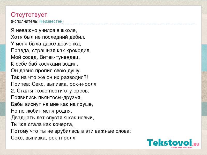 Я неважно учился в школе, Хотя был не последний дебил. У меня была даже девчонка, Правда, страшная как крокодил. Мой сосед, Витек-тунеядец, К себе баб косяками водил. Он давно пропил свою душу. Так на что же он их разводил?! Припев: Секс, выпивка, рок-н-ролл 2. Стал я тоже нести эту ересь: Появились пьянтосы-друзья, Бабы виснут на мне как на груше, Но не любит меня родня. Двадцать лет спустя я как новый, Ты же стала как кочерга, Потому что ты не врубилась в эти важные слова: Секс, выпивка, рок-н-ролл