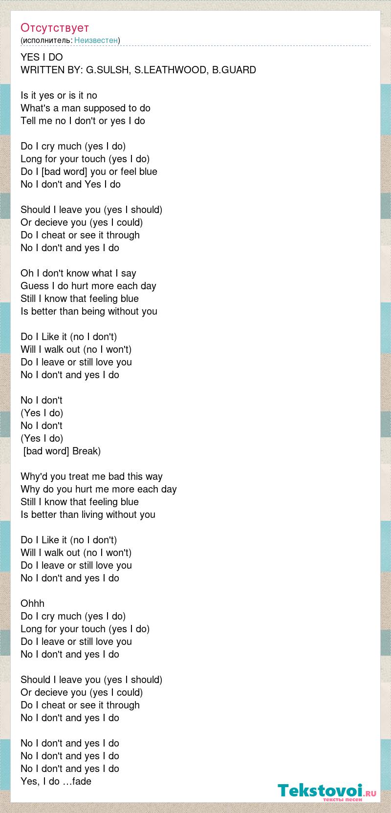 YES I DO WRITTEN BY: G.SULSH, S.LEATHWOOD, B.GUARD Is it yes or is it no What's a man supposed to do Tell me no I don't or yes I do Do I cry much (yes I do) Long for your touch (yes I do) Do I [bad word] you or feel blue No I don't and Yes I do Should I leave you (yes I should) Or decieve you (yes I could) Do I cheat or see it through No I don't and yes I do Oh I don't know what I say Guess I do hurt more each day Still I know that feeling blue Is better than being without you Do I Like it (no I don't) Will I walk out (no I won't) Do I leave or still love you No I don't and yes I do No I don't (Yes I do) No I don't (Yes I do) [bad word] Break) Why'd you treat me bad this way Why do you hurt me more each day Still I know that feeling blue Is better than living without you Do I Like it (no I don't) Will I walk out (no I won't) Do I leave or still love you No I don't and yes I do Ohhh Do I cry much (yes I do) Long for your touch (yes I do) Do I leave or still love you No I don't and yes I do Should I leave you (yes I should) Or decieve you (yes I could) Do I cheat or see it through No I don't and yes I do No I don't and yes I do No I don't and yes I do No I don't and yes I do Yes, I do …fade