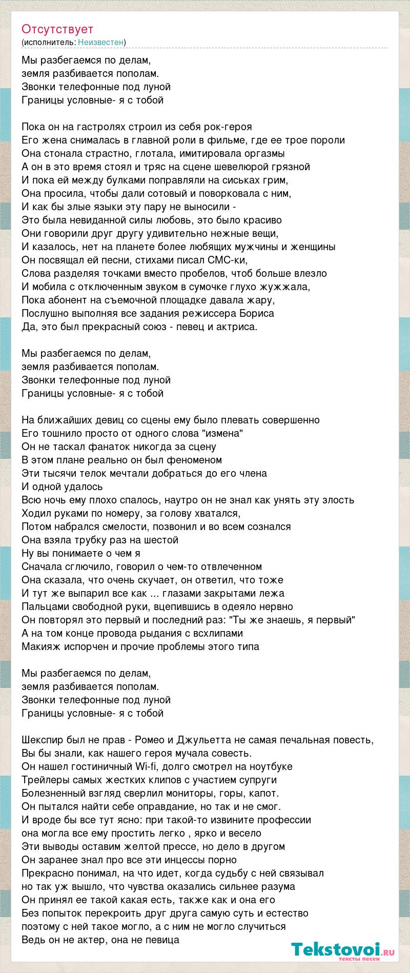 Мы разбегаемся по делам, земля разбивается пополам. Звонки телефонные под луной Границы условные- я с тобой Пока он на гастролях строил из себя рок-героя Его жена снималась в главной роли в фильме, где ее трое пороли Она стонала страстно, глотала, имитировала оргазмы А он в это время стоял и тряс на сцене шевелюрой грязной И пока ей между булками поправляли на сиськах грим, Она просила, чтобы дали сотовый и поворковала с ним, И как бы злые языки эту пару не выносили - Это была невиданной силы любовь, это было красиво Они говорили друг другу удивительно нежные вещи, И казалось, нет на планете более любящих мужчины и женщины Он посвящал ей песни, стихами писал СМС-ки, Слова разделяя точками вместо пробелов, чтоб больше влезло И мобила с отключенным звуком в сумочке глухо жужжала, Пока абонент на съемочной площадке давала жару, Послушно выполняя все задания режиссера Бориса Да, это был прекрасный союз - певец и актриса. Мы разбегаемся по делам, земля разбивается пополам. Звонки телефонные под луной Границы условные- я с тобой На ближайших девиц со сцены ему было плевать совершенно Его тошнило просто от одного слова "измена" Он не таскал фанаток никогда за сцену В этом плане реально он был феноменом Эти тысячи телок мечтали добраться до его члена И одной удалось Всю ночь ему плохо спалось, наутро он не знал как унять эту злость Ходил руками по номеру, за голову хватался, Потом набрался смелости, позвонил и во всем сознался Она взяла трубку раз на шестой Ну вы понимаете о чем я Сначала сглючило, говорил о чем-то отвлеченном Она сказала, что очень скучает, он ответил, что тоже И тут же выпарил все как ... глазами закрытами лежа Пальцами свободной руки, вцепившись в одеяло нервно Он повторял это первый и последний раз: "Ты же знаешь, я первый" А на том конце провода рыдания с всхлипами Макияж испорчен и прочие проблемы этого типа Мы разбегаемся по делам, земля разбивается пополам. Звонки телефонные под луной Границы условные- я с тобой Шекспир был не прав - Ромео и Джульетта не самая печальная повесть, Вы бы знали, как нашего героя мучала совесть. Он нашел гостиничный Wi-fi, долго смотрел на ноутбуке Трейлеры самых жестких клипов с участием супруги Болезненный взгляд сверлил мониторы, горы, капот. Он пытался найти себе оправдание, но так и не смог. И вроде бы все тут ясно: при такой-то извините профессии она могла все ему простить легко , ярко и весело Эти выводы оставим желтой прессе, но дело в другом Он заранее знал про все эти инцессы порно Прекрасно понимал, на что идет, когда судьбу с ней связывал но так уж вышло, что чувства оказались сильнее разума Он принял ее такой какая есть, также как и она его Без попыток перекроить друг друга самую суть и естество поэтому с ней такое могло, а с ним не могло случиться Ведь он не актер, она не певица