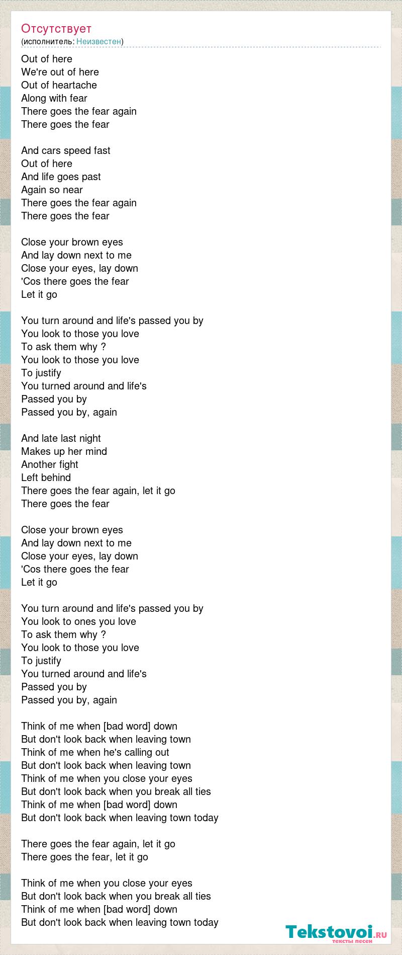 Out of here We're out of here Out of heartache Along with fear There goes the fear again There goes the fear And cars speed fast Out of here And life goes past Again so near There goes the fear again There goes the fear Close your brown eyes And lay down next to me Close your eyes, lay down 'Cos there goes the fear Let it go You turn around and life's passed you by You look to those you love To ask them why ? You look to those you love To justify You turned around and life's Passed you by Passed you by, again And late last night Makes up her mind Another fight Left behind There goes the fear again, let it go There goes the fear Close your brown eyes And lay down next to me Close your eyes, lay down 'Cos there goes the fear Let it go You turn around and life's passed you by You look to ones you love To ask them why ? You look to those you love To justify You turned around and life's Passed you by Passed you by, again Think of me when [bad word] down But don't look back when leaving town Think of me when he's calling out But don't look back when leaving town Think of me when you close your eyes But don't look back when you break all ties Think of me when [bad word] down But don't look back when leaving town today There goes the fear again, let it go There goes the fear, let it go Think of me when you close your eyes But don't look back when you break all ties Think of me when [bad word] down But don't look back when leaving town today
