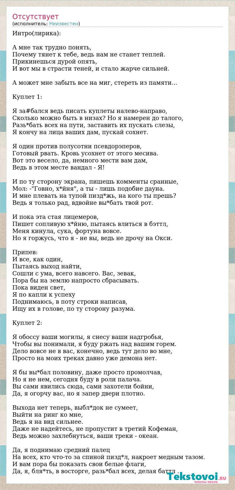 Интро(лирика): А мне так трудно понять, Почему тянет к тебе, ведь нам не станет теплей. Прикинешься дурой опять, И вот мы в страсти теней, и стало жарче сильней. А может мне забыть все на миг, стереть из памяти... Куплет 1: Я за#бался ведь писать куплеты налево-направо, Сколько можно быть в низах? Но я намерен до талого, Разь*бать всех на пути, заставить их пускать слезы, Я кончу на лица ваших дам, пускай сохнет. Я один против полусотни псевдорэперов, Готовый рвать. Кровь усохнет от этого месива. Вот это весело, да, немного мести вам дам, Ведь в этом месте вандал - Я! И по ту сторону экрана, пишешь комменты сранные, Мол: -"Говно, х*йня", а ты - лишь подобие дауна. И мне плевать на тупой пизд*жь, на кого ты прешь? Ведь я только рад, вдвойне вы*бать твой рот. И пока эта стая лицемеров, Пишет сопливую х*йню, пытаясь влиться в бэттл, Меня кинула, сука, фортуна вовсе. Но я горжусь, что я - не вы, ведь не дрочу на Окси. Припев: И все, как один, Пытаясь выход найти, Сошли с ума, всего навсего. Вас, зевак, Пора бы на землю напросто сбрасывать. Пока виден свет, Я по капли к успеху Поднимаюсь, в поту строки написав, Ищу их в голове, по ту сторону разума. Куплет 2: Я обоссу ваши могилы, я снесу ваши надгробья, Чтобы вы понимали, я буду ржать над вашим горем. Дело вовсе не в вас, конечно, ведь тут дело во мне, Просто на моих треках давно уже демона нет. Я бы вы*бал половину, даже просто промолчав, Но я не нем, сегодня буду в роли палача. Вы сами явились сюда, сами захотели бойни, Да, я огорчу вас, но я запер двери плотно. Выхода нет теперь, выбл*док не сумеет, Выйти на ринг ко мне, Ведь я на вид сильнее. Даже не надейтесь, не пропустит в третий Кофеман, Ведь можно захлебнуться, ваши треки - океан. Да, я поднимаю средний палец На всех, кто что-то за спиной пизд*л, накроет медным тазом. И вам пора бы показать свои белые флаги, Да, я, бля*ть, в восторге, разь*бал всех, делая баттл .