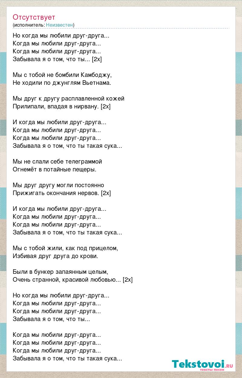 Но когда мы любили друг-друга... Когда мы любили друг-друга... Когда мы любили друг-друга... Забывала я о том, что ты... [2х] Мы с тобой не бомбили Камбоджу, Не ходили по джунглям Вьетнама. Мы друг к другу расплавленной кожей Прилипали, впадая в нирвану. [2х] И когда мы любили друг-друга... Когда мы любили друг-друга... Когда мы любили друг-друга... Забывала я о том, что ты такая сука... Мы не слали себе телеграммой Огнемёт в потайные пещеры. Мы друг другу могли постоянно Прижигать окончания нервов. [2х] И когда мы любили друг-друга... Когда мы любили друг-друга... Когда мы любили друг-друга... Забывала я о том, что ты такая сука... Мы с тобой жили, как под прицелом, Избивая друг друга до крови. Были в бункер запаянным целым, Очень странной, красивой любовью... [2х] Но когда мы любили друг-друга... Когда мы любили друг-друга... Когда мы любили друг-друга... Забывала я о том, что ты... Когда мы любили друг-друга... Когда мы любили друг-друга... Когда мы любили друг-друга... Забывала я о том, что ты такая сука...