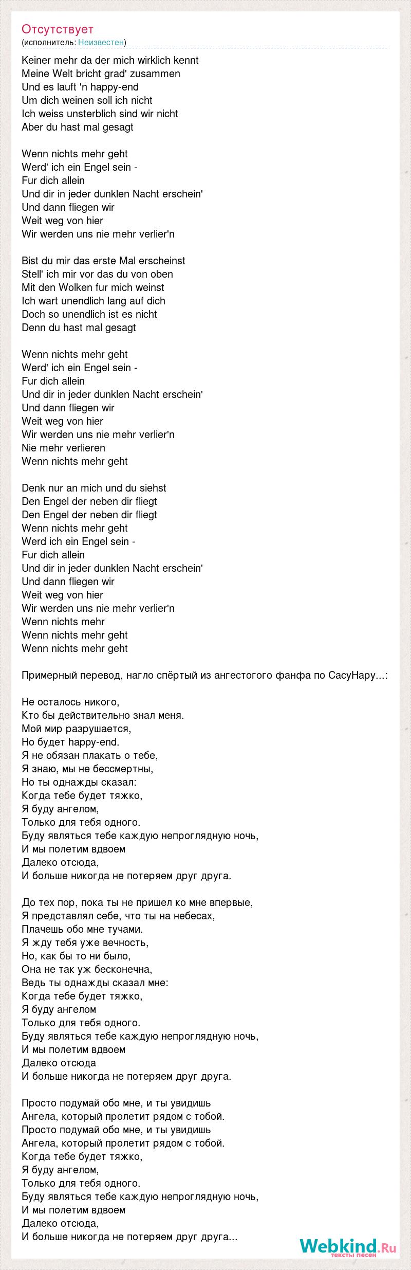 Keiner mehr da der mich wirklich kennt Meine Welt bricht grad' zusammen Und es lauft 'n happy-end Um dich weinen soll ich nicht Ich weiss unsterblich sind wir nicht Aber du hast mal gesagt Wenn nichts mehr geht Werd' ich ein Engel sein - Fur dich allein Und dir in jeder dunklen Nacht erschein' Und dann fliegen wir Weit weg von hier Wir werden uns nie mehr verlier'n Bist du mir das erste Mal erscheinst Stell' ich mir vor das du von oben Mit den Wolken fur mich weinst Ich wart unendlich lang auf dich Doch so unendlich ist es nicht Denn du hast mal gesagt Wenn nichts mehr geht Werd' ich ein Engel sein - Fur dich allein Und dir in jeder dunklen Nacht erschein' Und dann fliegen wir Weit weg von hier Wir werden uns nie mehr verlier'n Nie mehr verlieren Wenn nichts mehr geht Denk nur an mich und du siehst Den Engel der neben dir fliegt Den Engel der neben dir fliegt Wenn nichts mehr geht Werd ich ein Engel sein - Fur dich allein Und dir in jeder dunklen Nacht erschein' Und dann fliegen wir Weit weg von hier Wir werden uns nie mehr verlier'n Wenn nichts mehr Wenn nichts mehr geht Wenn nichts mehr geht Примерный перевод, нагло спёртый из ангестогого фанфа по СасуНару...: Не осталось никого, Кто бы действительно знал меня. Мой мир разрушается, Но будет happy-end. Я не обязан плакать о тебе, Я знаю, мы не бессмертны, Но ты однажды сказал: Когда тебе будет тяжко, Я буду ангелом, Только для тебя одного. Буду являться тебе каждую непроглядную ночь, И мы полетим вдвоем Далеко отсюда, И больше никогда не потеряем друг друга. До тех пор, пока ты не пришел ко мне впервые, Я представлял себе, что ты на небесах, Плачешь обо мне тучами. Я жду тебя уже вечность, Но, как бы то ни было, Она не так уж бесконечна, Ведь ты однажды сказал мне: Когда тебе будет тяжко, Я буду ангелом Только для тебя одного. Буду являться тебе каждую непроглядную ночь, И мы полетим вдвоем Далеко отсюда И больше никогда не потеряем друг друга. Просто подумай обо мне, и ты увидишь Ангела, который пролетит рядом с тобой. Просто подумай обо мне, и ты увидишь Ангела, который пролетит рядом с тобой. Когда тебе будет тяжко, Я буду ангелом, Только для тебя одного. Буду являться тебе каждую непроглядную ночь, И мы полетим вдвоем Далеко отсюда, И больше никогда не потеряем друг друга...