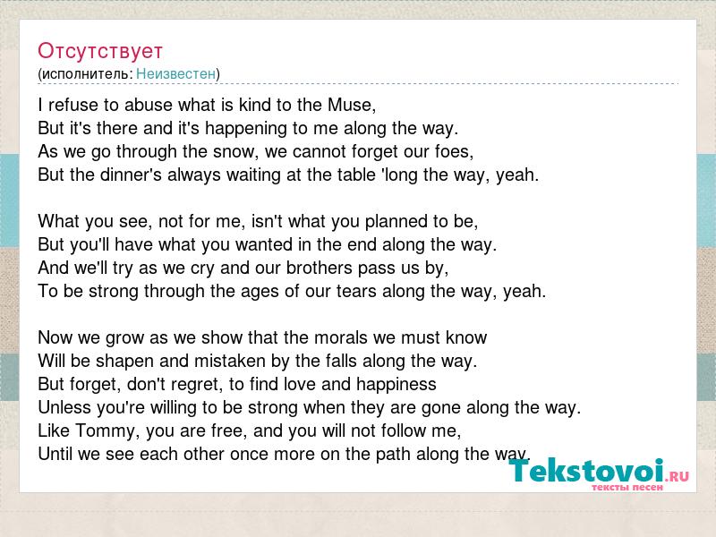 I refuse to abuse what is kind to the Muse, But it's there and it's happening to me along the way. As we go through the snow, we cannot forget our foes, But the dinner's always waiting at the table 'long the way, yeah. What you see, not for me, isn't what you planned to be, But you'll have what you wanted in the end along the way. And we'll try as we cry and our brothers pass us by, To be strong through the ages of our tears along the way, yeah. Now we grow as we show that the morals we must know Will be shapen and mistaken by the falls along the way. But forget, don't regret, to find love and happiness Unless you're willing to be strong when they are gone along the way. Like Tommy, you are free, and you will not follow me, Until we see each other once more on the path along the way.