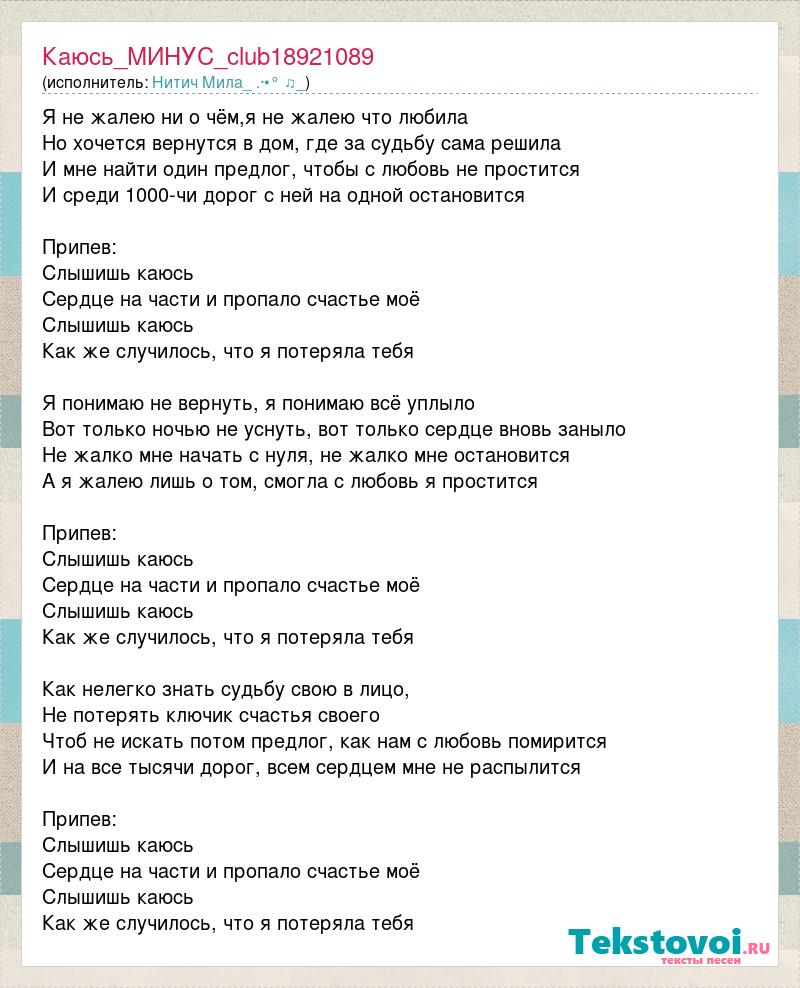 Я не жалею ни о чём,я не жалею что любила Но хочется вернутся в дом, где за судьбу сама решила И мне найти один предлог, чтобы с любовь не простится И среди 1000-чи дорог с ней на одной остановится Припев: Слышишь каюсь Сердце на части и пропало счастье моё Слышишь каюсь Как же случилось, что я потеряла тебя Я понимаю не вернуть, я понимаю всё уплыло Вот только ночью не уснуть, вот только сердце вновь заныло Не жалко мне начать с нуля, не жалко мне остановится А я жалею лишь о том, смогла с любовь я простится Припев: Слышишь каюсь Сердце на части и пропало счастье моё Слышишь каюсь Как же случилось, что я потеряла тебя Как нелегко знать судьбу свою в лицо, Не потерять ключик счастья своего Чтоб не искать потом предлог, как нам с любовь помирится И на все тысячи дорог, всем сердцем мне не распылится Припев: Слышишь каюсь Сердце на части и пропало счастье моё Слышишь каюсь Как же случилось, что я потеряла тебя