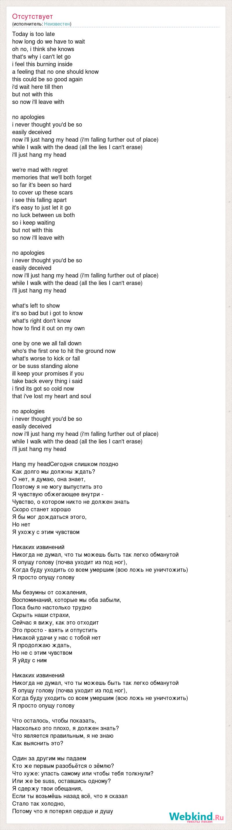 Hang my headСегодня слишком поздно