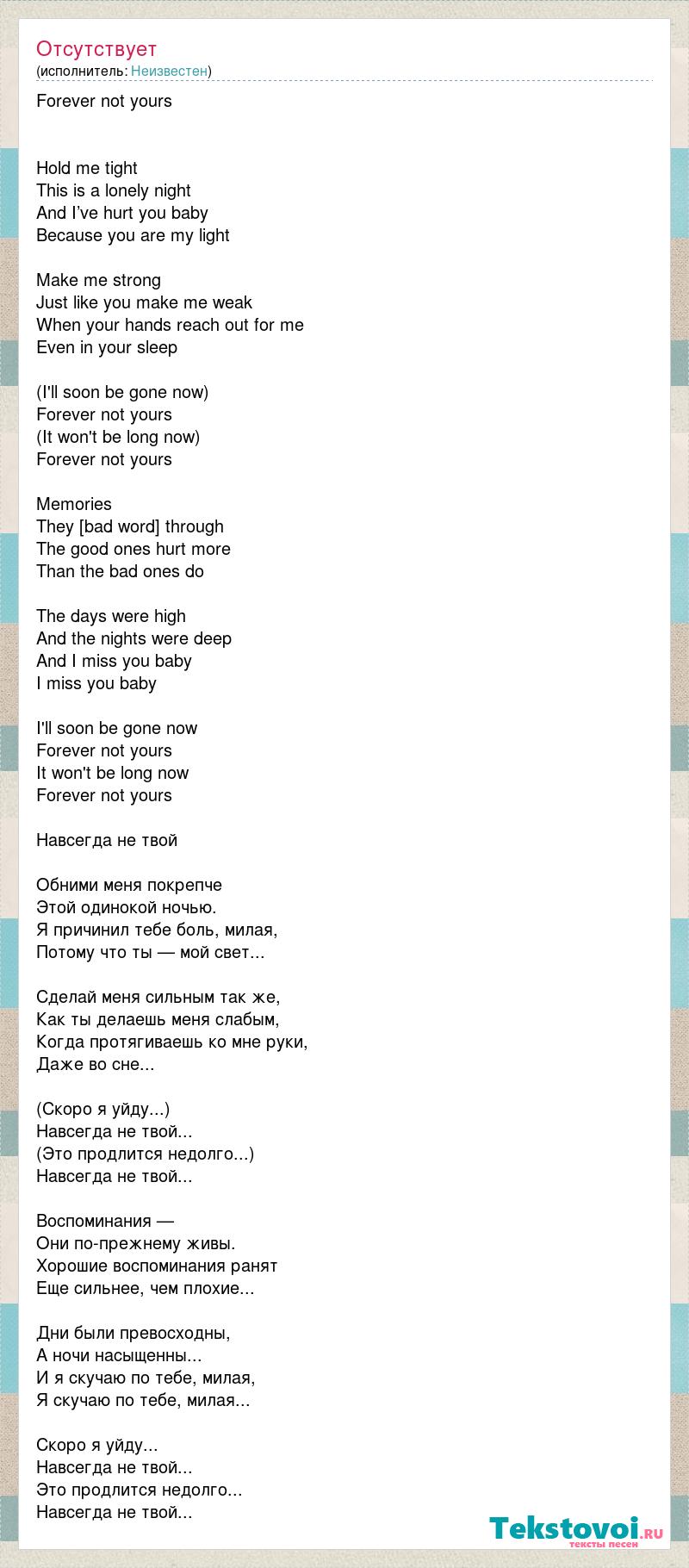 Forever not yours Hold me tight This is a lonely night And I’ve hurt you baby Because you are my light Make me strong Just like you make me weak When your hands reach out for me Even in your sleep (I'll soon be gone now) Forever not yours (It won't be long now) Forever not yours Memories They [bad word] through The good ones hurt more Than the bad ones do The days were high And the nights were deep And I miss you baby I miss you baby I'll soon be gone now Forever not yours It won't be long now Forever not yours Навсегда не твой Обними меня покрепче Этой одинокой ночью. Я причинил тебе боль, милая, Потому что ты — мой свет... Сделай меня сильным так же, Как ты делаешь меня слабым, Когда протягиваешь ко мне руки, Даже во сне... (Скоро я уйду...) Навсегда не твой... (Это продлится недолго...) Навсегда не твой... Воспоминания — Они по-прежнему живы. Хорошие воспоминания ранят Еще сильнее, чем плохие... Дни были превосходны, А ночи насыщенны... И я скучаю по тебе, милая, Я скучаю по тебе, милая... Скоро я уйду... Навсегда не твой... Это продлится недолго... Навсегда не твой...