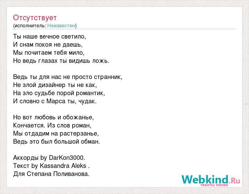 Ты наше вечное светило, И снам покоя не даешь, Мы почитаем тебя мило, Но ведь глазах ты видишь ложь. Ведь ты для нас не просто странник, Не злой дизайнер ты не как, На зло судьбе порой романтик, И словно с Марса ты, чудак. Но вот любовь и обожанье, Кончается. Из слов роман, Мы отдадим на растерзанье, Ведь это был большой обман. Аккорды by DarKon3000. Текст by Kassandra Aleks . Для Степана Поливанова.