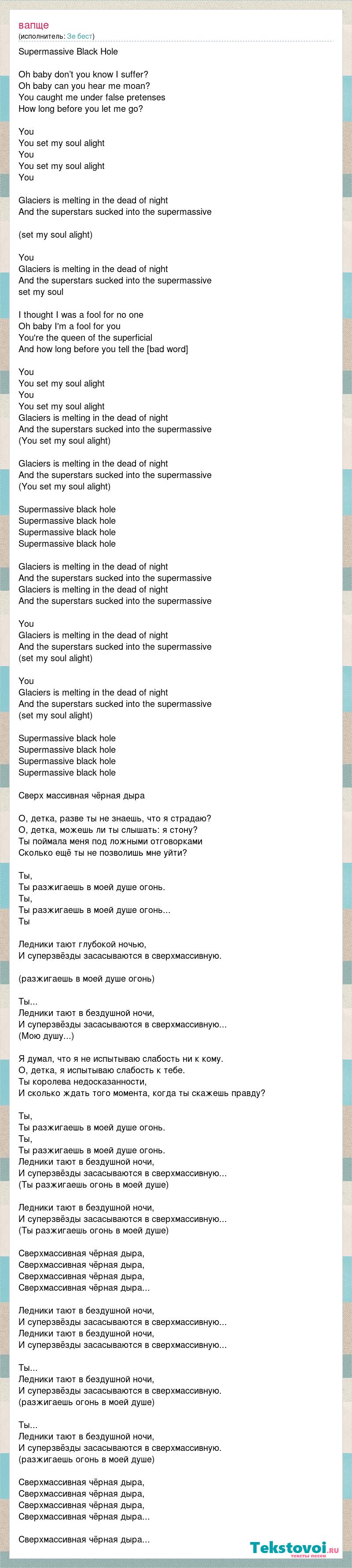 Supermassive Black Hole Oh baby don’t you know I suffer? Oh baby can you hear me moan? You caught me under false pretenses How long before you let me go? You You set my soul alight You You set my soul alight You Glaciers is melting in the dead of night And the superstars sucked into the supermassive (set my soul alight) You Glaciers is melting in the dead of night And the superstars sucked into the supermassive set my soul I thought I was a fool for no one Oh baby I'm a fool for you You're the queen of the superficial And how long before you tell the [bad word] You You set my soul alight You You set my soul alight Glaciers is melting in the dead of night And the superstars sucked into the supermassive (You set my soul alight) Glaciers is melting in the dead of night And the superstars sucked into the supermassive (You set my soul alight) Supermassive black hole Supermassive black hole Supermassive black hole Supermassive black hole Glaciers is melting in the dead of night And the superstars sucked into the supermassive Glaciers is melting in the dead of night And the superstars sucked into the supermassive You Glaciers is melting in the dead of night And the superstars sucked into the supermassive (set my soul alight) You Glaciers is melting in the dead of night And the superstars sucked into the supermassive (set my soul alight) Supermassive black hole Supermassive black hole Supermassive black hole Supermassive black hole Сверх массивная чёрная дыра О, детка, разве ты не знаешь, что я страдаю? О, детка, можешь ли ты слышать: я стону? Ты поймала меня под ложными отговорками Сколько ещё ты не позволишь мне уйти? Ты, Ты разжигаешь в моей душе огонь. Ты, Ты разжигаешь в моей душе огонь... Ты Ледники тают глубокой ночью, И суперзвёзды засасываются в сверхмассивную. (разжигаешь в моей душе огонь) Ты... Ледники тают в бездушной ночи, И суперзвёзды засасываются в сверхмассивную... (Mою душу...) Я думал, что я не испытываю слабость ни к кому. О, детка, я испытываю слабость к тебе. Ты королева недосказанности, И сколько ждать того момента, когда ты скажешь правду? Ты, Ты разжигаешь в моей душе огонь. Ты, Ты разжигаешь в моей душе огонь. Ледники тают в бездушной ночи, И суперзвёзды засасываются в сверхмассивную... (Ты разжигаешь огонь в моей душе) Ледники тают в бездушной ночи, И суперзвёзды засасываются в сверхмассивную... (Ты разжигаешь огонь в моей душе) Сверхмассивная чёрная дыра, Сверхмассивная чёрная дыра, Сверхмассивная чёрная дыра, Сверхмассивная чёрная дыра... Ледники тают в бездушной ночи, И суперзвёзды засасываются в сверхмассивную... Ледники тают в бездушной ночи, И суперзвёзды засасываются в сверхмассивную... Ты... Ледники тают в бездушной ночи, И суперзвёзды засасываются в сверхмассивную. (разжигаешь огонь в моей душе) Ты... Ледники тают в бездушной ночи, И суперзвёзды засасываются в сверхмассивную. (разжигаешь огонь в моей душе) Сверхмассивная чёрная дыра, Сверхмассивная чёрная дыра, Сверхмассивная чёрная дыра, Сверхмассивная чёрная дыра... Сверхмассивная чёрная дыра...