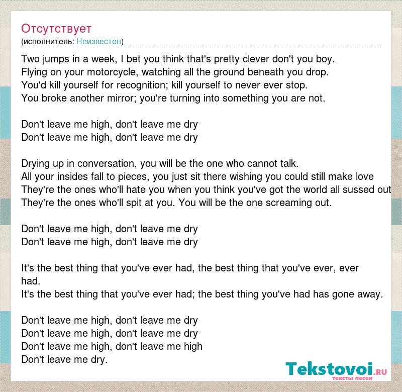 Two jumps in a week, I bet you think that's pretty clever don't you boy. Flying on your motorcycle, watching all the ground beneath you drop. You'd kill yourself for recognition; kill yourself to never ever stop. You broke another mirror; you're turning into something you are not. Don't leave me high, don't leave me dry Don't leave me high, don't leave me dry Drying up in conversation, you will be the one who cannot talk. All your insides fall to pieces, you just sit there wishing you could still make love They're the ones who'll hate you when you think you've got the world all sussed out They're the ones who'll spit at you. You will be the one screaming out. Don't leave me high, don't leave me dry Don't leave me high, don't leave me dry It's the best thing that you've ever had, the best thing that you've ever, ever had. It's the best thing that you've ever had; the best thing you've had has gone away. Don't leave me high, don't leave me dry Don't leave me high, don't leave me dry Don't leave me high, don't leave me high Don't leave me dry.